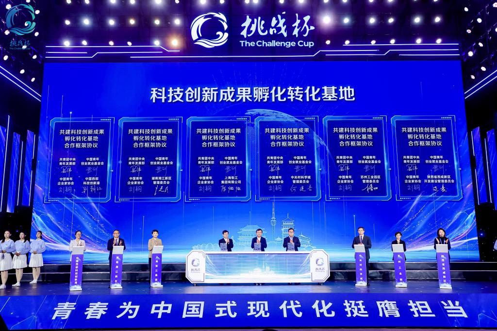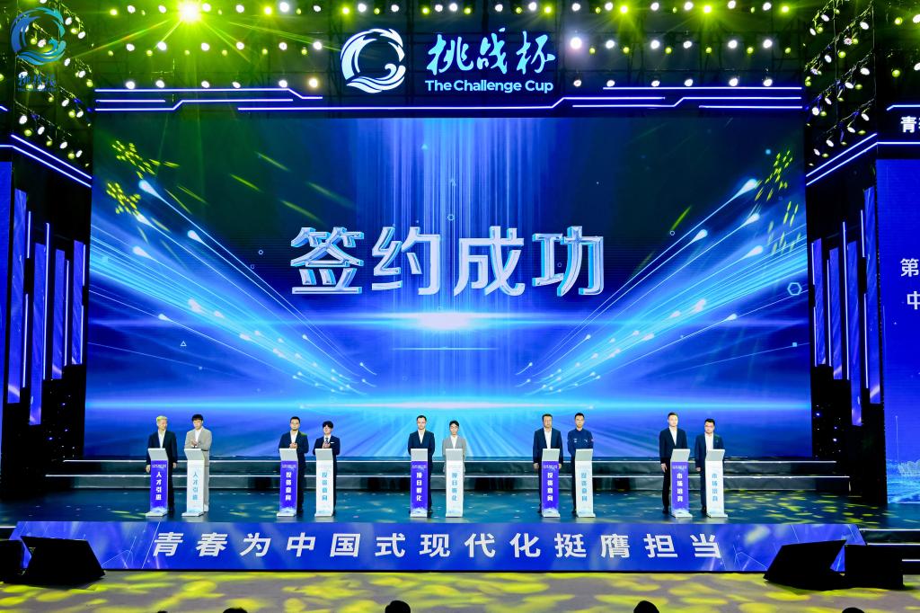 闭幕会上,签约环节进一步助力大赛“后半篇文章”落地生根。团中央青年发展部、中国青年创业就业基金会、中国青年企业家协会与中关村科学城、上海张江集团、苏州工业园区、湖南湘江新区、陕西省西咸新区、中国西部科技创新港六家单位签订共建“挑战杯”大学生科技创新成果孵化转化基地合作框架协议。来自西安交通大学等5所学校的优秀创业项目负责人与秦创原发展股份有限公司、陕西金资基金管理有限公司、陕西资本市场服务中心进行了现场签约。