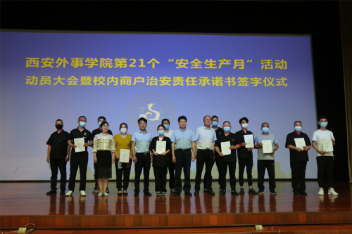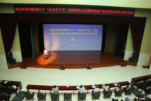 今年6月是第21个全国“安全生产月”。6月2日下午,2022年西安外事学院第21个“安全生产月”活动动员大会暨校内商户治安责任承诺书签字仪式在仰信厅举行。西安外事学院保障部部长张小刚及安全保卫办公室、后勤产业中心和老子学院校内商铺相关负责人、商户代表参会。