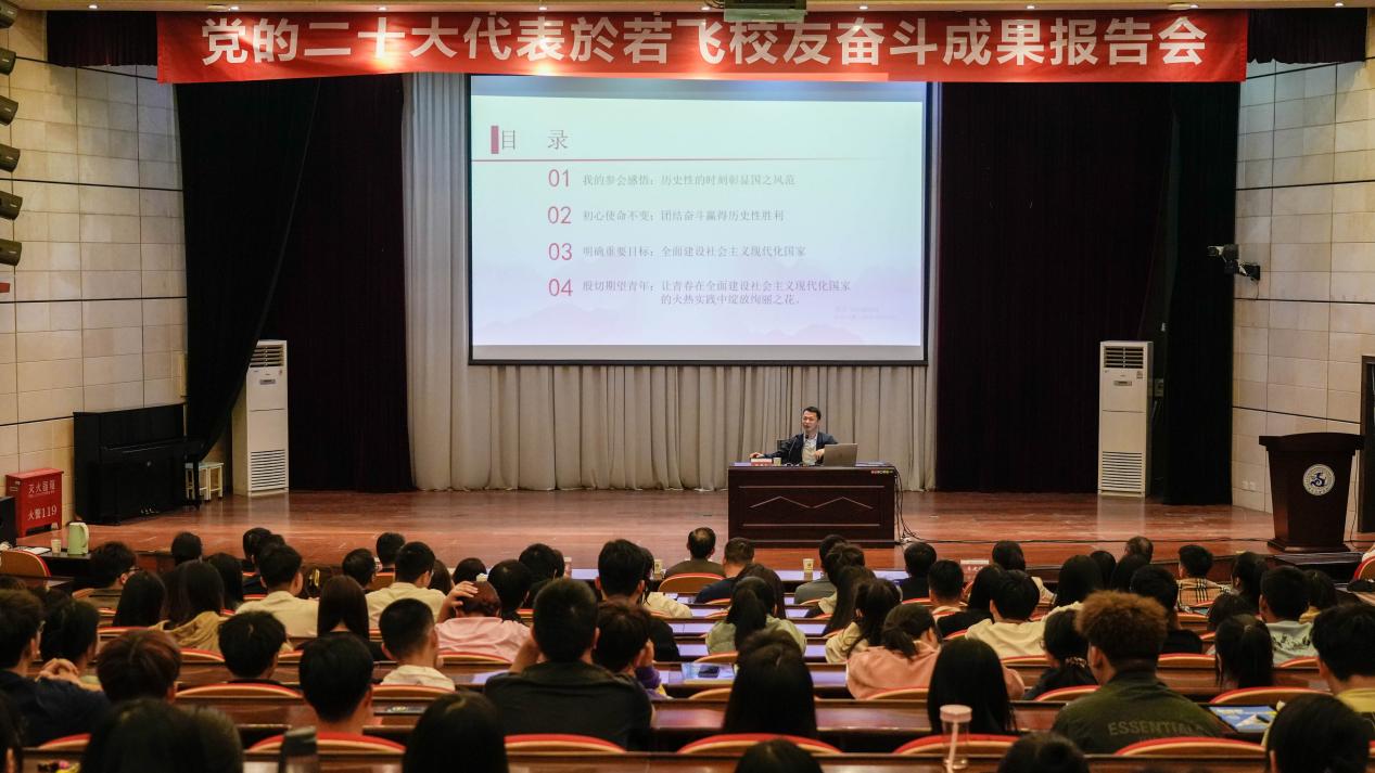 为学习贯彻习近平新时代中国特色社会主义思想主题教育,推动党的二十大精神宣传贯彻走深走实,2023年5月23日上午,西安外事学院邀请党的二十大代表、2015届优秀校友於若飞,在学术苑二号报告厅作题为“让青春在持续奋斗中绽放绚丽之花”奋斗成果报告。