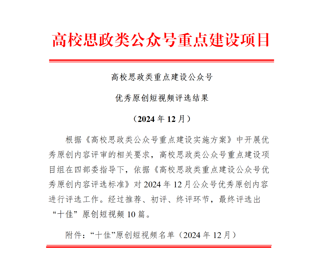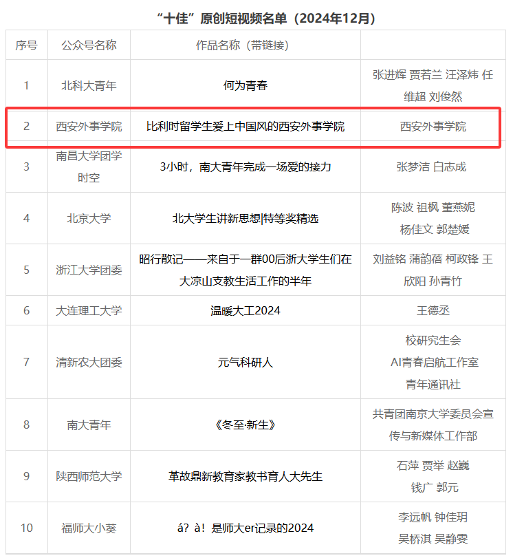 日前,高校思政类公众号重点建设项目组在中央宣传部、中央网信办、教育部、共青团中央指导下,依据《高校思政类重点建设公众号优秀原创内容评选标准》,开展了2024年12月至2025年2月公众号优秀原创内容评选工作。经过推荐、初评、终评环节,最终评选出“十佳”原创短视频。西安外事学院选送的作品《比利时留学生爱上中国风的西安外事学院》与北京大学、浙江大学等高校作品一同获评2024年12月“十佳”原创短视频内容。