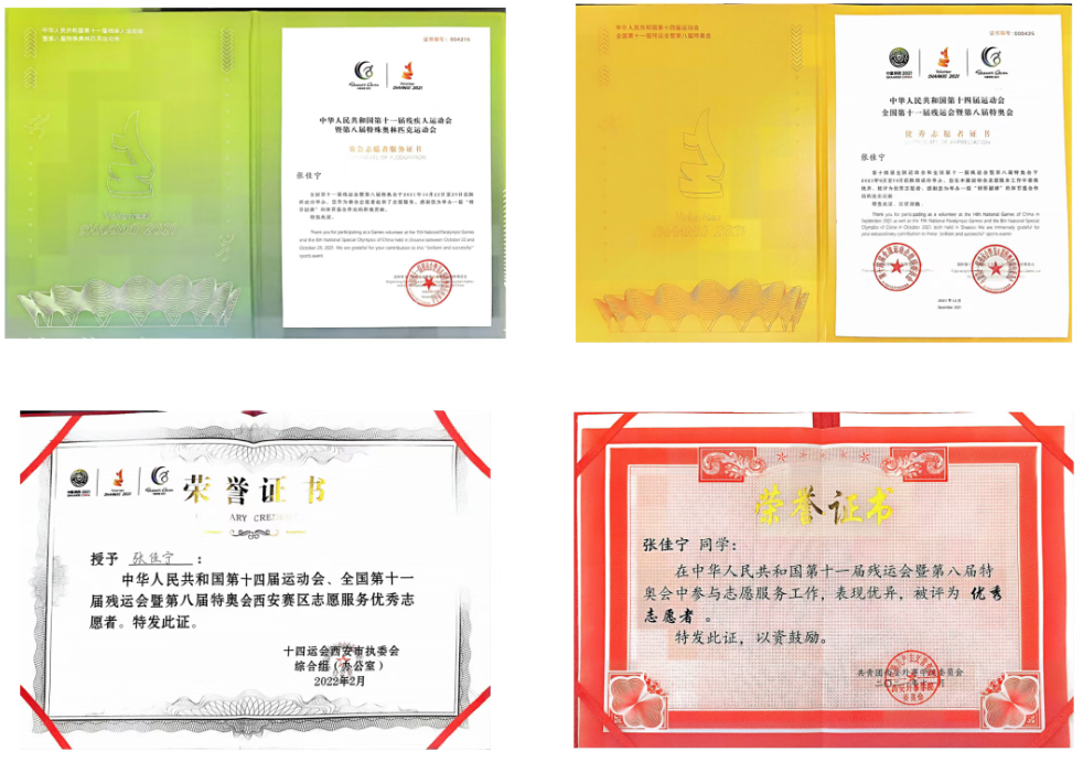 2021年,她以“小秦宝”的身份投身十四运会志愿服务,张佳宁带领48名志愿者见证繁星照亮的古都。面对无臂选手坚持完赛的震撼,她深刻体会到“热爱是战胜一切的力量”。这次活动让她斩获省、市、校三级“优秀志愿者”荣誉,成为学校第一个此类活动“奖项大满贯”获得者。她始终坚信:志愿红不仅是服装的颜色,更是青春热血的底色。