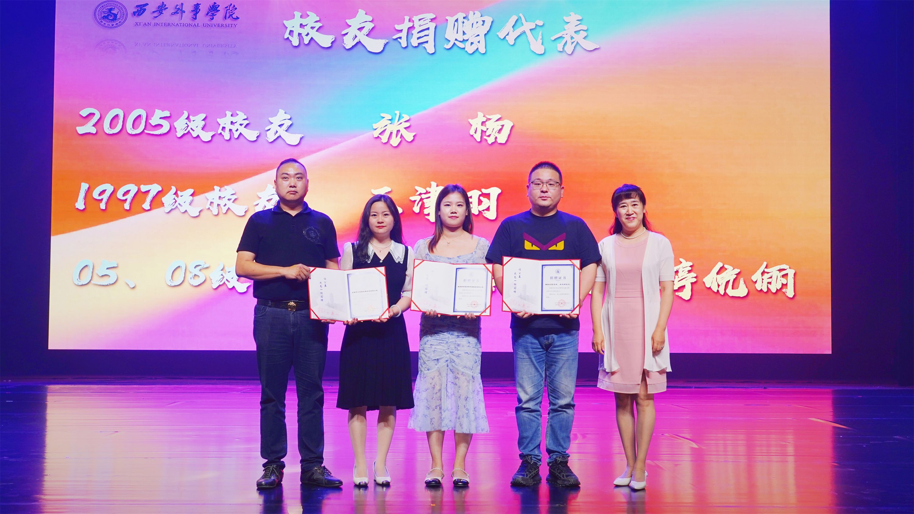 校庆之际,众多校友饮水思源,向母校捐款捐物,为教育事业发展贡献力量。05 级国际贸易专业校友、合肥华大优益生物技术有限公司、深圳华大基因农业控股有限公司董事长兼运营总监张杨,捐赠价值10万元的医疗产品;97级旅游管理专业校友,陕西津羽玺国际贸易集团有限公司董事长王津羽,捐款3万元;05级工商企业管理专业校友、合肥金陆名品商贸有限责任公司总经理陆忠培,与08 级护理专业校友束庆婷,以夫妻名义捐款2万元。西安外事学院党委副书记、教育基金会理事长刘亚杰为捐赠校友颁发捐赠证书。