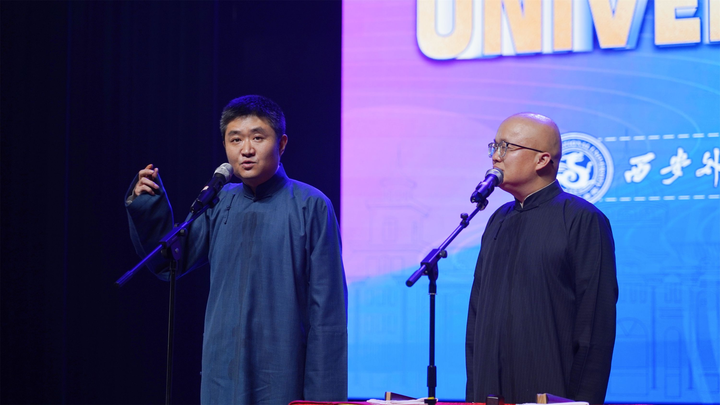 同时,本次活动也是西安外事学院与陕西省曲艺家协会文艺“六进”志愿服务活动的深度融合。陕西省曲艺家协会主席苗阜、陕西省曲艺家协会秘书长杨钊等艺术家、曲艺新秀为大家带来一场传统文化传承与创新的视听盛宴。节目涵盖相声、快板、京韵大鼓等丰富多彩的形式。师生校友在欢乐中追忆芳华,于曲艺中感受深情。