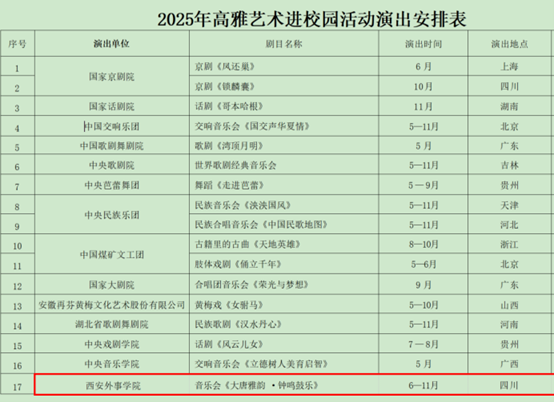 近日,教育部办公厅、文化和旅游部办公厅、财政部办公厅联合发布《关于开展2025年高雅艺术进校园活动的通知》,西安外事学院精心创排的西安鼓乐非遗主题《大唐雅韵·钟鸣鼓乐》音乐会与国家京剧院、国家话剧院、中国交响乐团等演出单位的剧目,共同成功入选“2025年高雅艺术进校园活动演出剧目名单”,这也是学校首次入选教育部高雅艺术进校园活动。此次入选不仅是对学校艺术教育成果的充分肯定,更是对西安外事学院中华优秀传统文化教育传承与创新的高度认可。