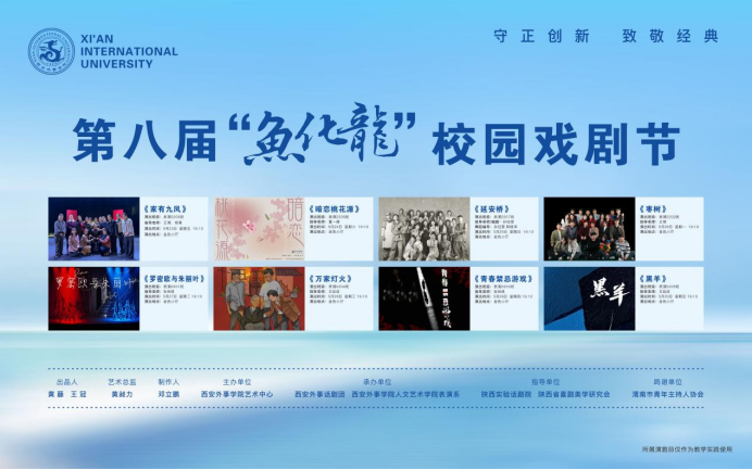 2025年,正值西安外事学院建校33周年,也是学校深入推进高质量发展的关键之年。自5月23日起,第八届“鱼化龙”校园戏剧节在金色小厅连续演出八场。本届戏剧节由艺术中心和西安外事话剧团策划牵头组织,人文艺术学院表演系师生共同筹备。首场话剧作品《家有九凤》精彩的演出拉开了戏剧节帷幕。