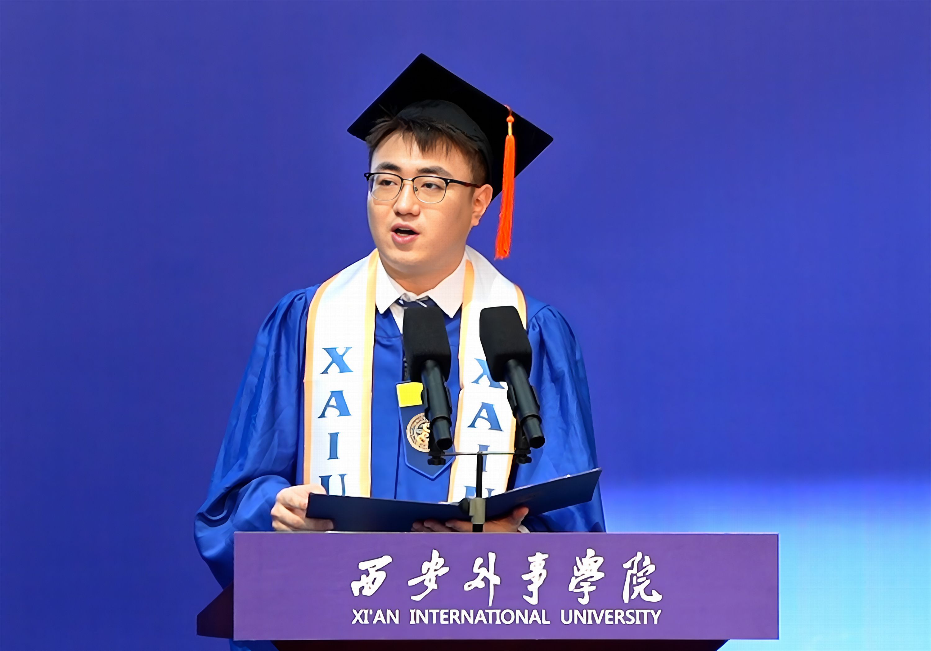 中国青年志愿者优秀个人、全国大学生数学建模大赛二等奖获得者郭森代表毕业生发言,他向母校、师长、家人、同窗致以最崇高的敬意和最真挚的感谢。他讲到:“大学已将校训和校风,连同鱼化湖的波光、图书馆的灯火,深深烙印在生命的年轮里。未来,校训将成为同学们破解时代命题的精神密码,如同灯塔让同学们彼此守望、传递温暖。同学们将带着在西安外事学院淬炼的品格、能力和情怀,以努力奋斗为母校更添荣光!”
