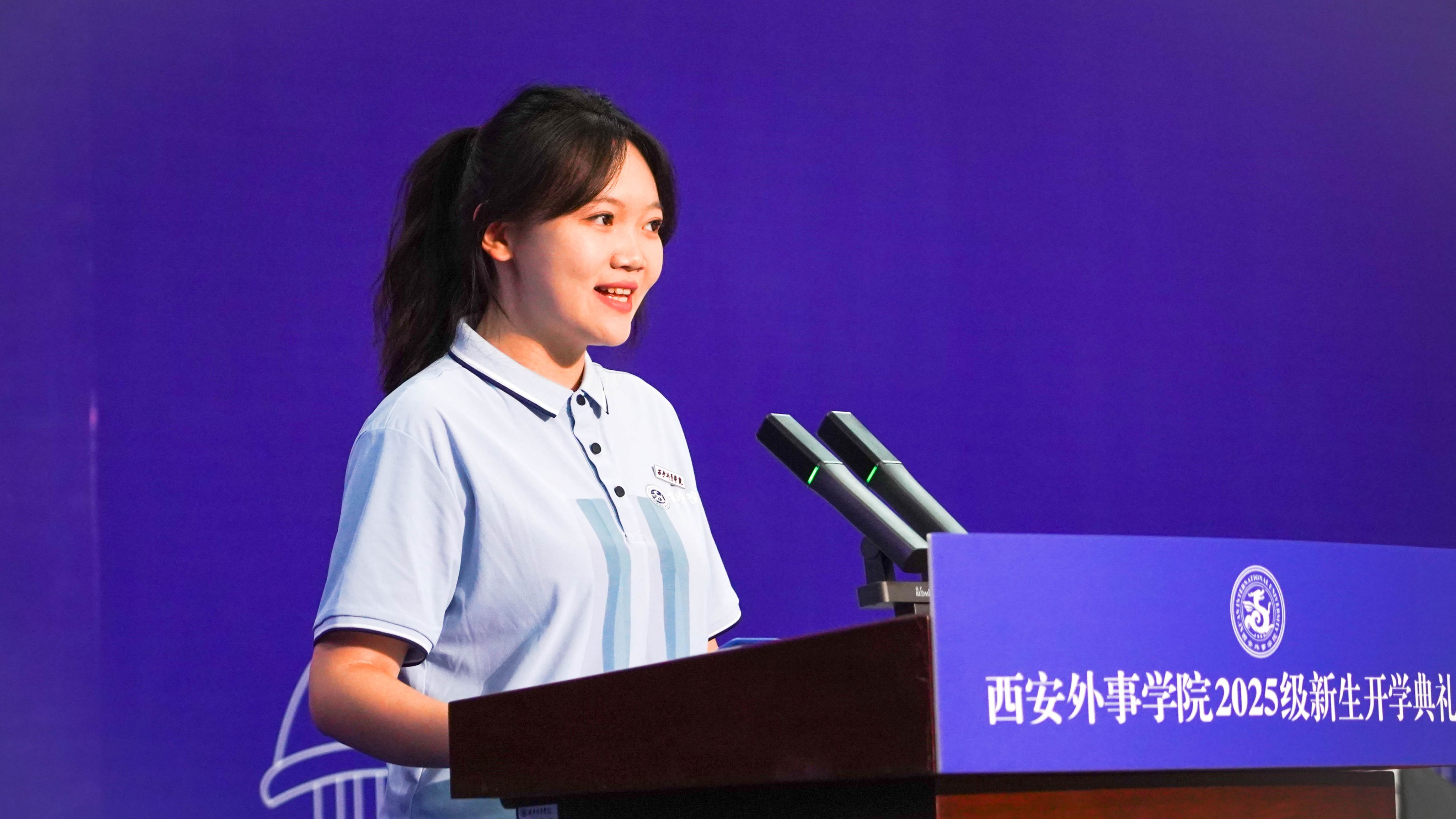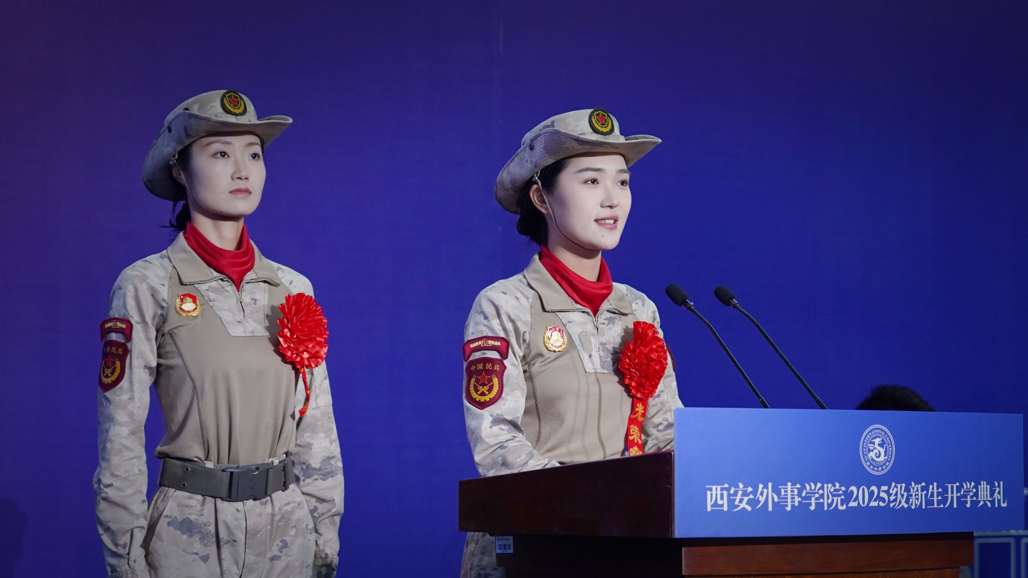 汉语国际教育专业学生李广颖、汉语言文学专业学生牛强强英姿飒爽,迈着铿锵整齐的步伐走上主席台。她们刚刚参加了纪念中国人民抗日战争暨世界反法西斯战争胜利80周年阅兵式的民兵方队。李广颖深情且坚定地分享了自己将军旅淬炼、阅兵荣光与校训融为一体的故事,展现了外事学子的担当与精神底色。