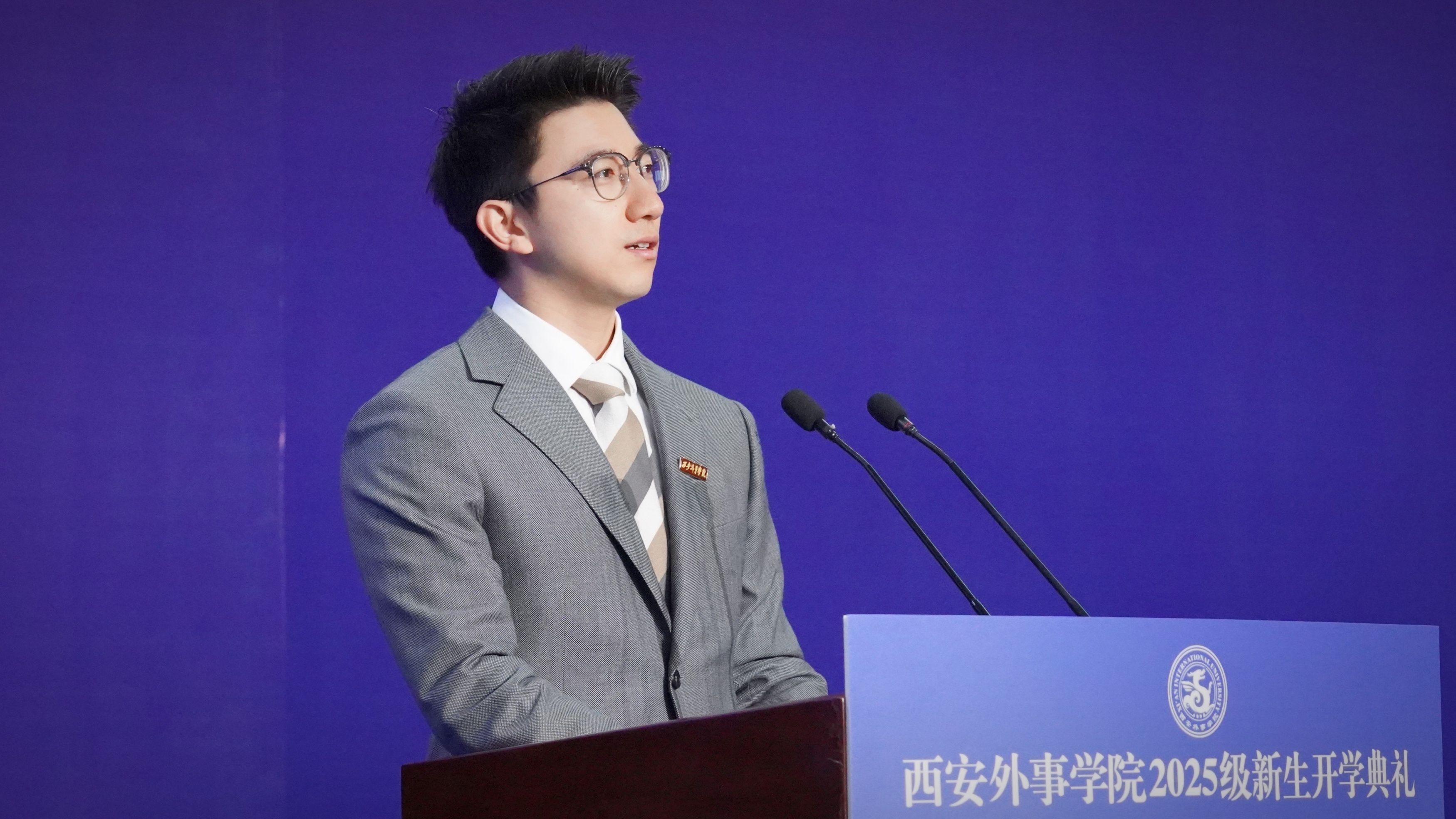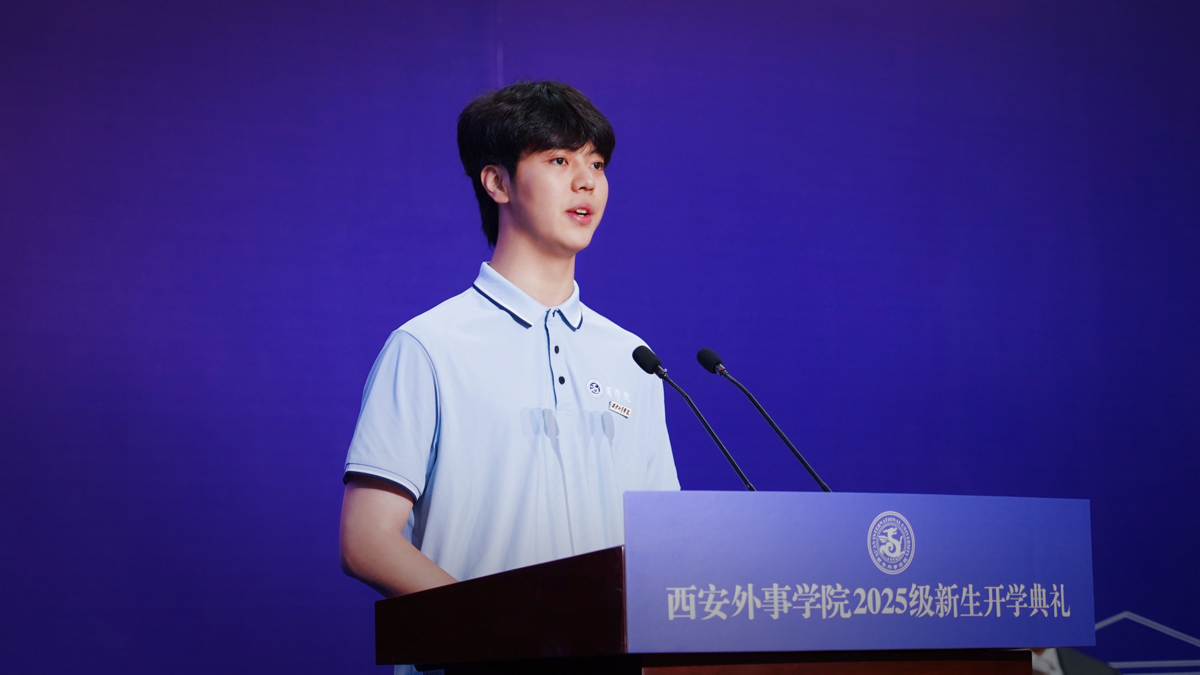 会计学专业郝正伟、大数据与会计专业金孟新作为新生代表分别作了发言,真挚分享了对大学学习生活的无限期待。郝正伟说:“‘鱼化龙’像一种精神指引——昭示着每个外事学子都能有跨越山海、突破自我的勇气。”“同学们将以校训为灯塔,在专业学习中深耕不辍,在服务社会中实现价值。”金孟新说:“外事不仅是知识的殿堂,更是锤炼品格和追逐理想的沃土。”“未来,我们要认真实践,明大学之道,做最可爱的外事人。”