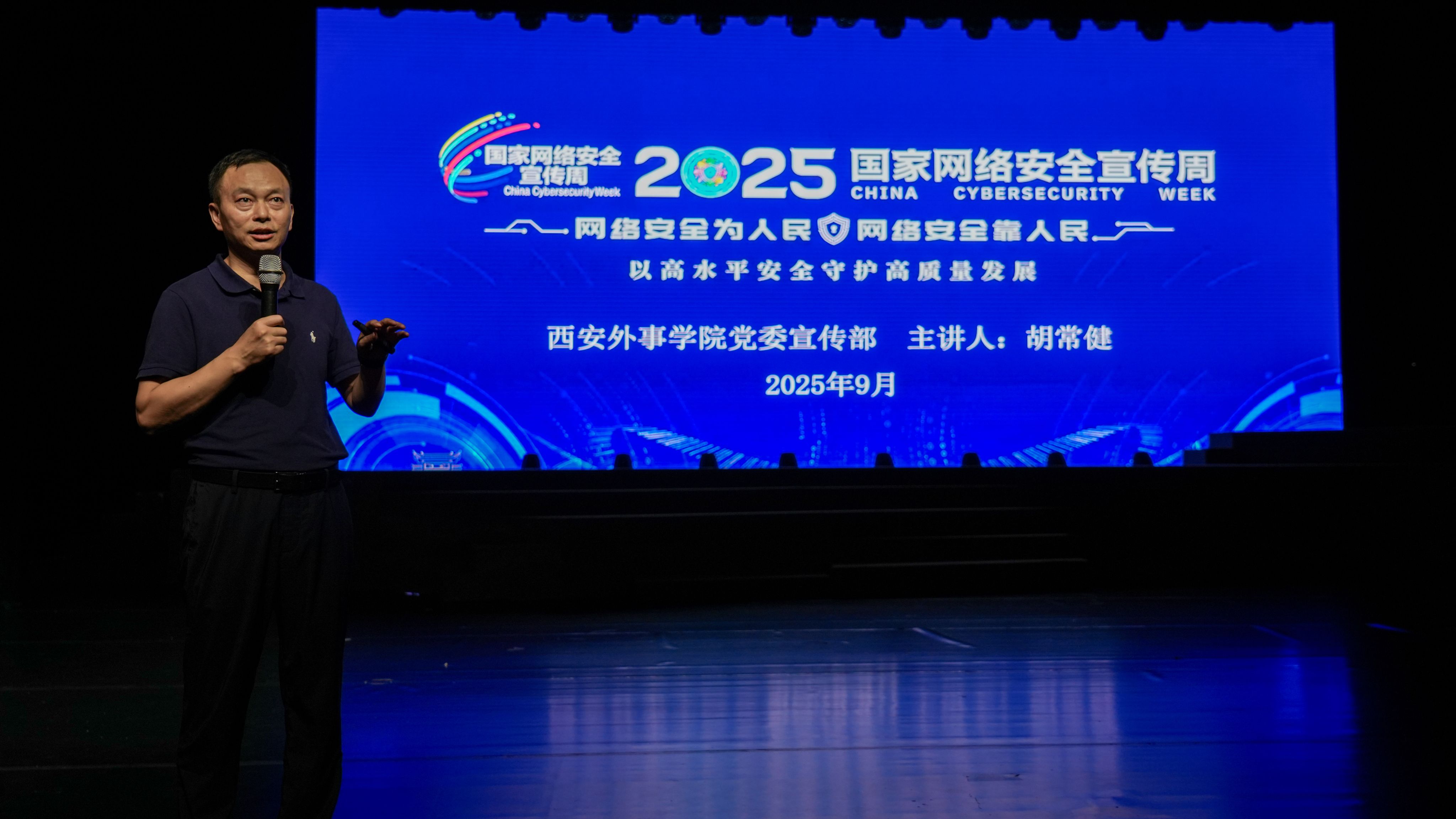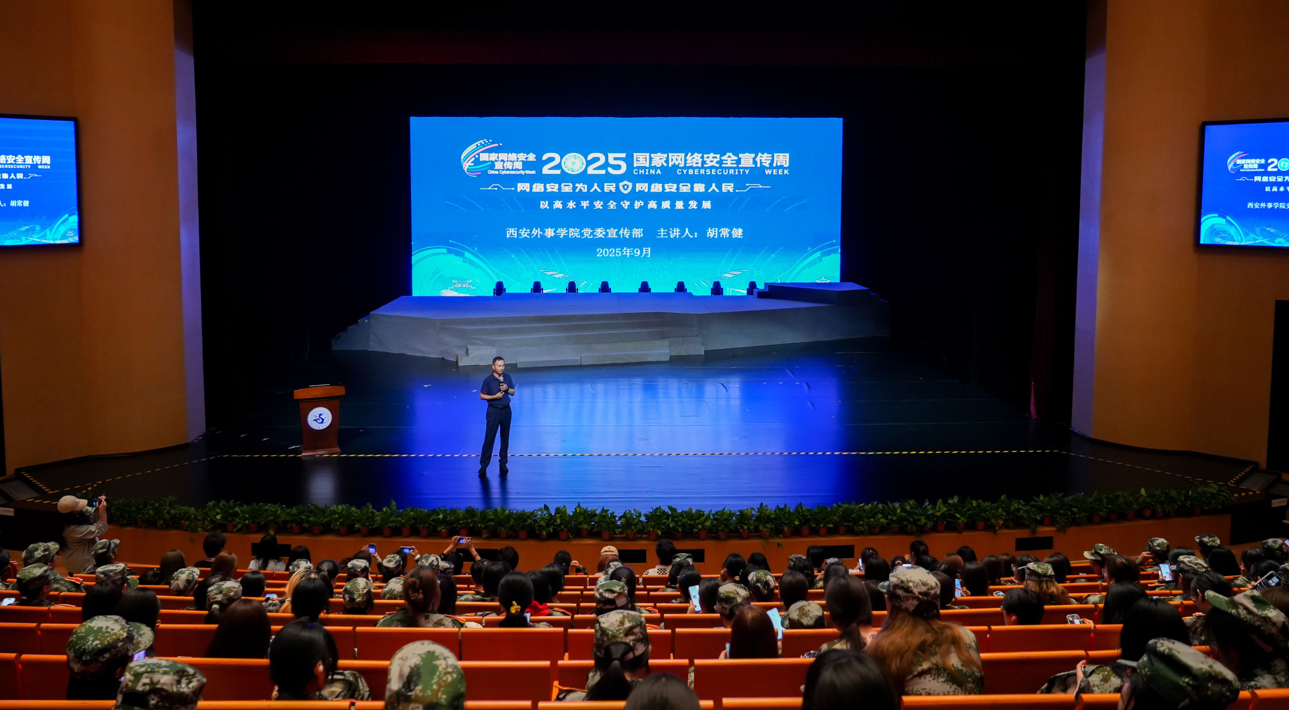 9月15日,首场主题讲座在西安鼓乐大剧院拉开帷幕,学校党委宣传部副部长胡常健担任主讲人,现场座无虚席。讲座从贯彻大会精神,守牢网络安全底线;深化案例警示,坚决破除“网络四害”;防范风险隐患,切实增强安全意识;维护校园网络,助力平安校园建设等方面,将政策解读与实例分析相结合,让法律法规与安全知识变得通俗易懂。尤其是,结合学生学习生活实际,剖析“网络四害”即网络谣言、泄露个人信息、网络暴力、网络诈骗的危害机理,梳理隐私泄露、账号被盗等潜在风险的防范要点。