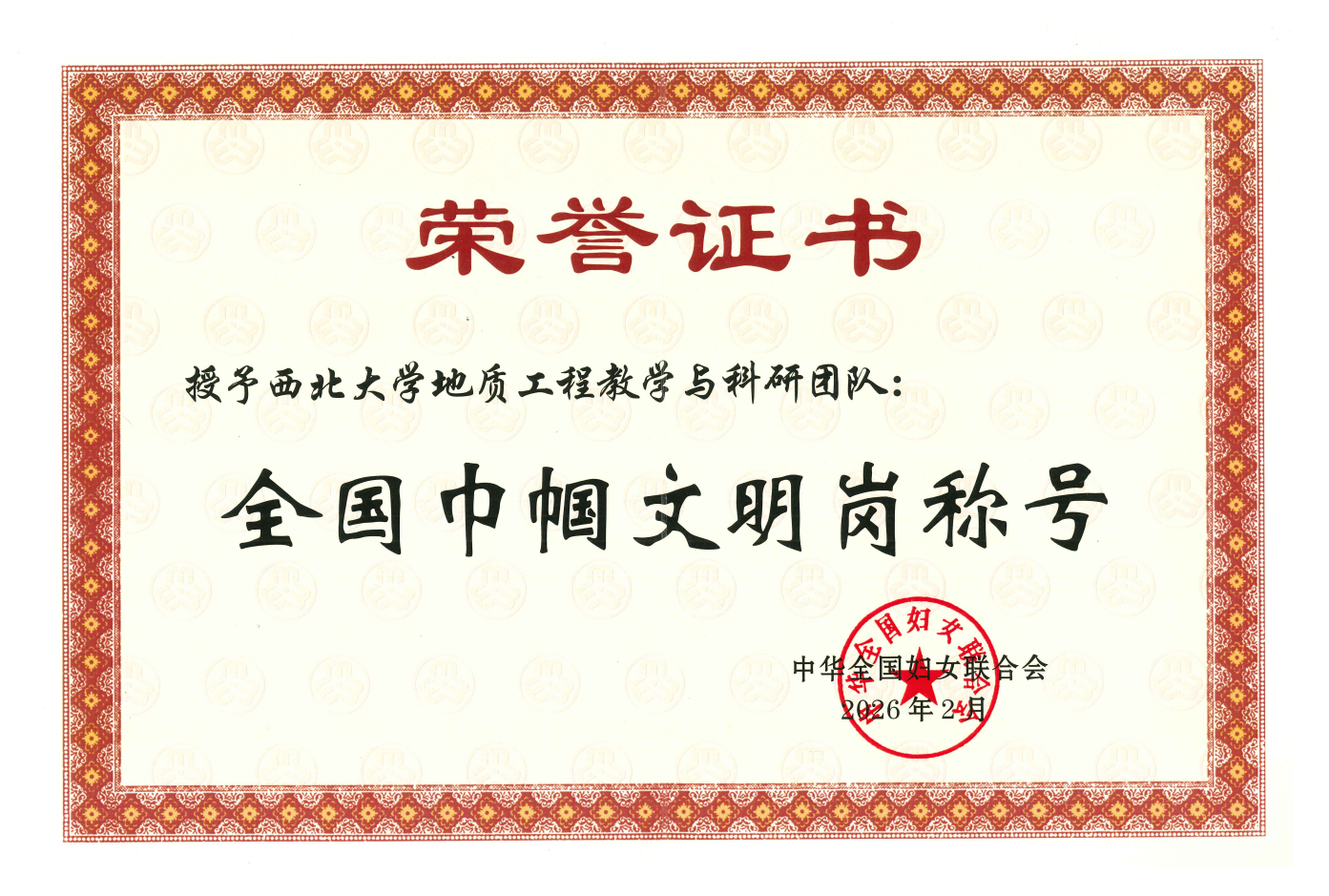 近日,全国妇联在京举行纪念“三八”国际妇女节暨表彰大会,对全国三八红旗手标兵、全国三八红旗手、全国三八红旗集体和全国巾帼文明岗进行表彰。西北大学地质学系地质工程教学与科研团队荣获全国巾帼文明岗,并在3月6日举办的陕西省纪念“三八”国际妇女节116周年暨表彰大会上领奖。
