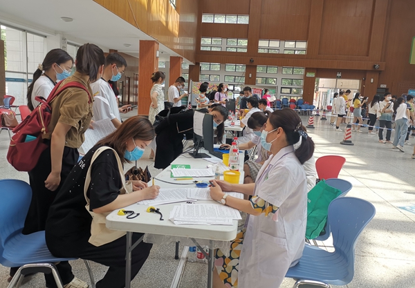 14日是端午节,接种工作未因节日受影响。“虽然很累很辛苦,但是能为校园安全和师生健康出一份力,这个端午节我们过得特别有意义!”校医院工作人员说道。