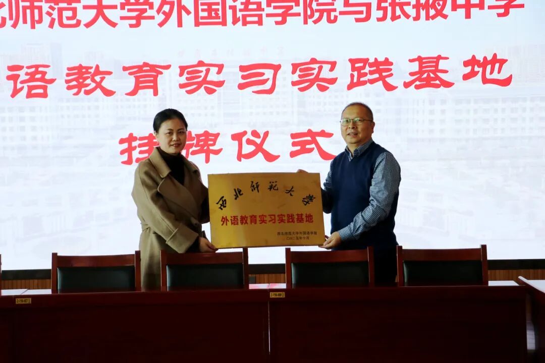 在与会人员的共同见证下,陈倩副院长代表西北师范大学外国语学院向张掖中学正式授予“外语教育实习实践基地”牌匾。这一仪式不仅象征着两校合作的正式启动,更承载着共育外语人才的使命与担当。