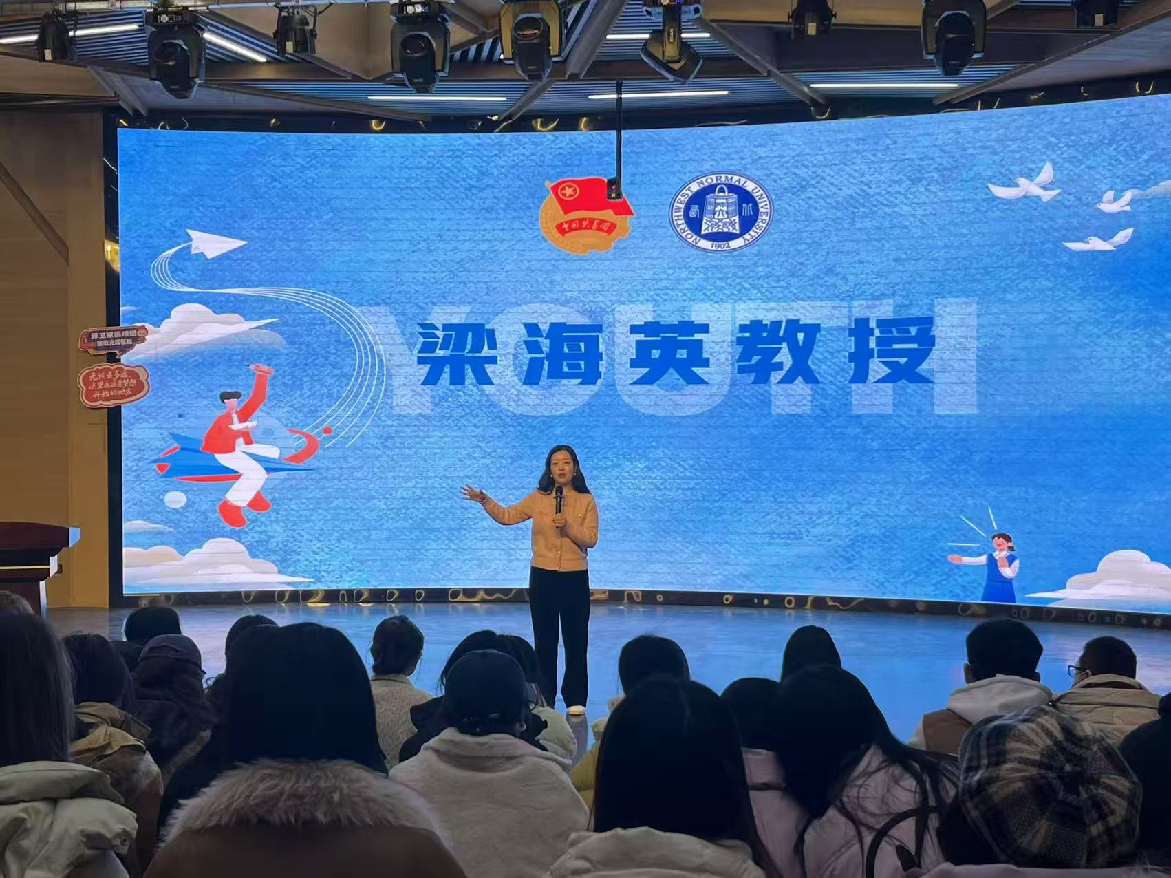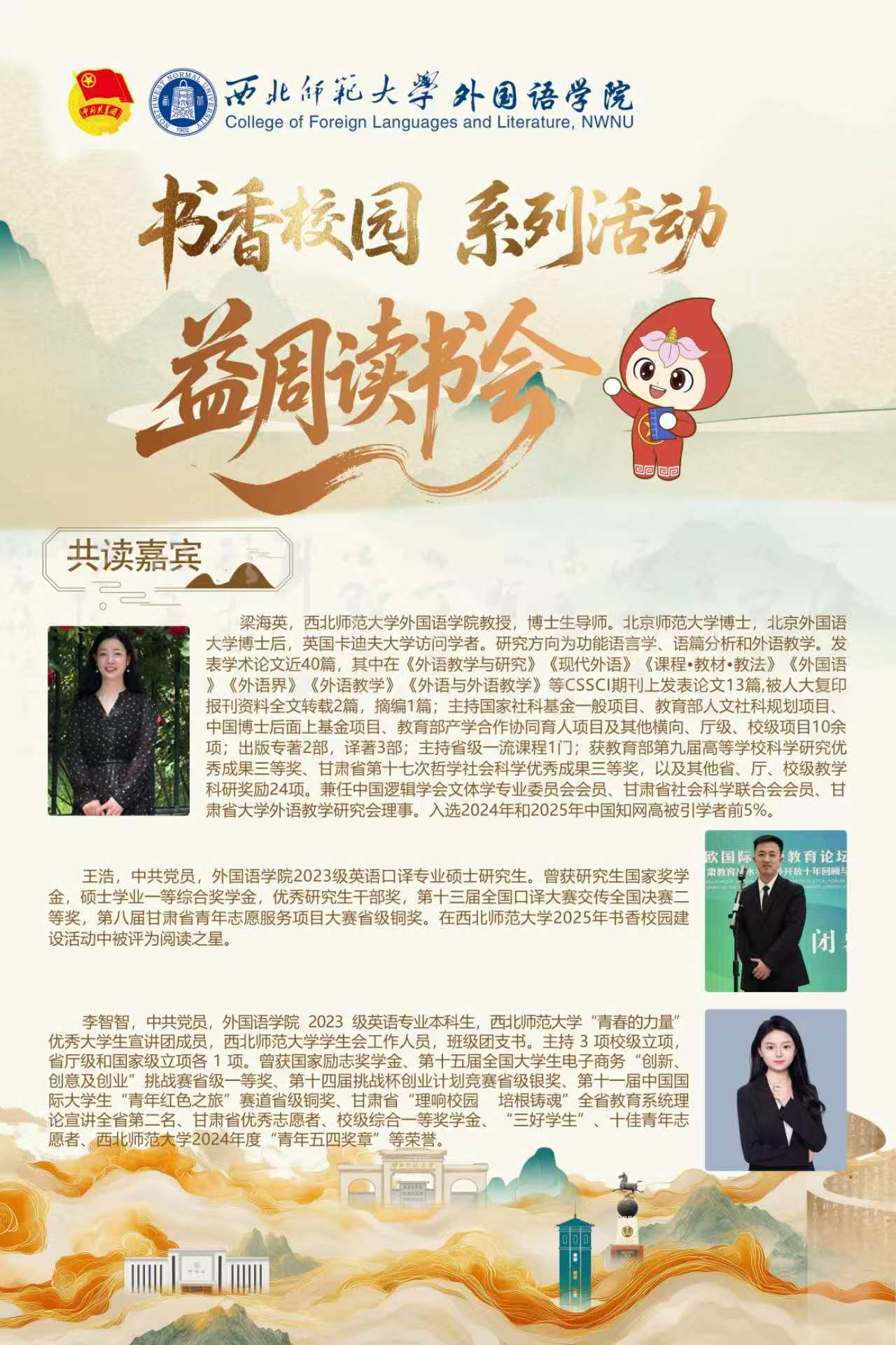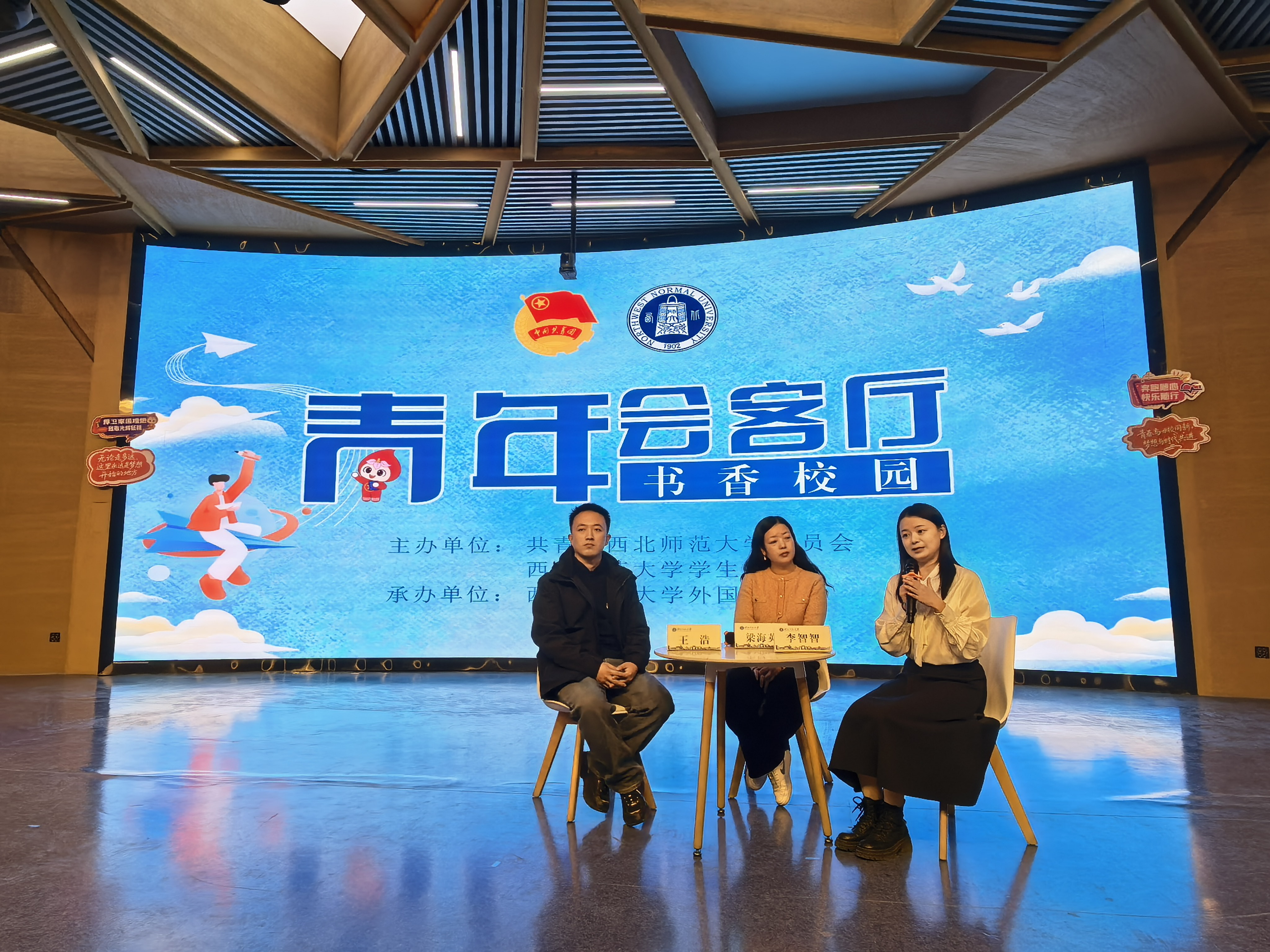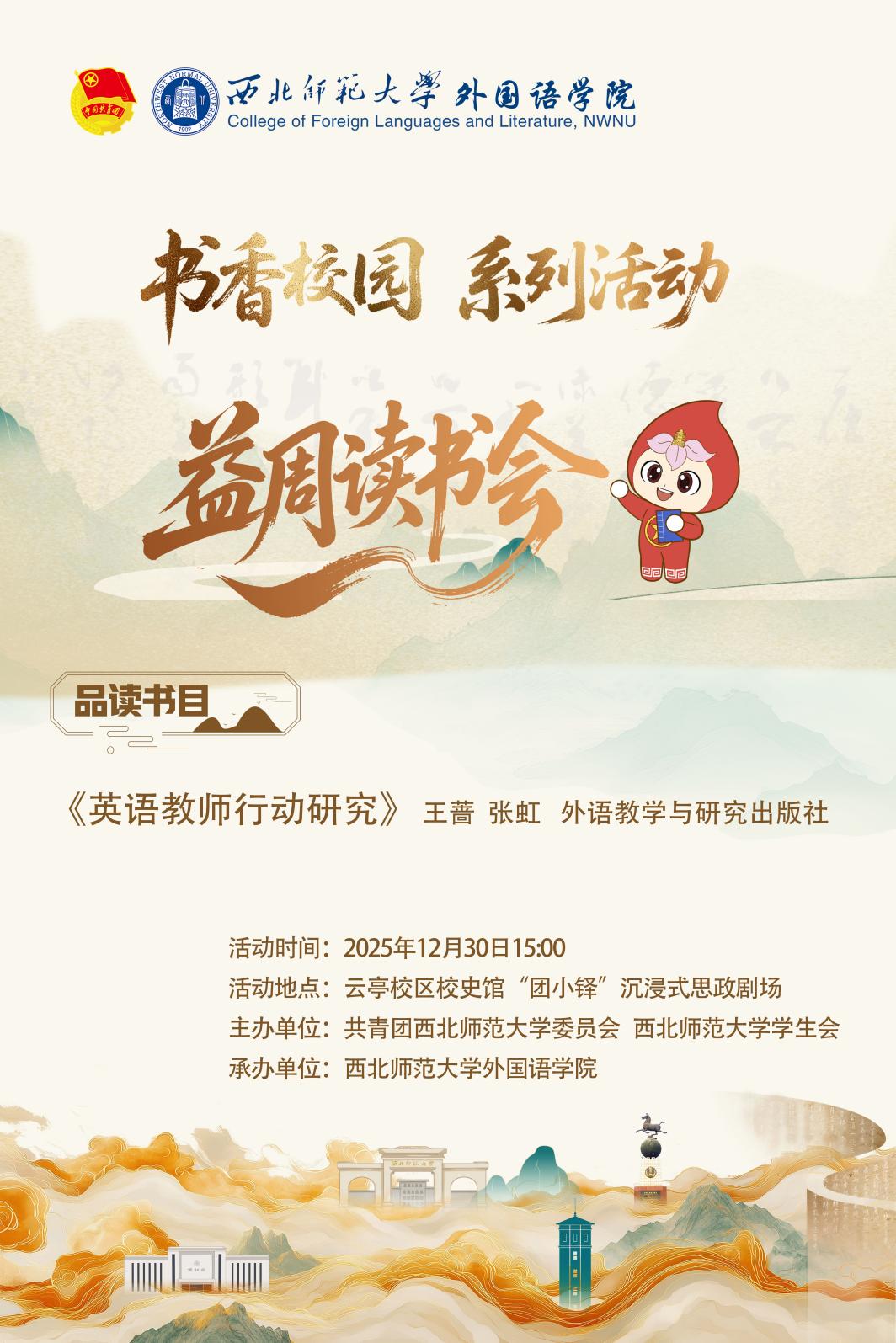 12月30日下午,外国语学院第八十三期“益”周读书会在云亭校区校史馆“团小铎”沉浸式思政剧场举办。本期读书会特邀梁海英教授主讲,研究生代表王浩、本科生代表李智智分享,本硕60余名学生参与。