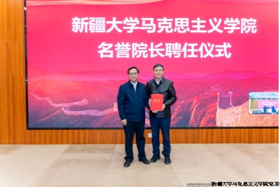 会议第一阶段,举行了新疆大学马克思主义学院名誉院长聘任仪式。代斌教授为新疆大学博峰战略人才、国务院学位委员会马克思主义理论、中共党史党建学学科评议组召集人骆郁廷教授颁发聘任证书。