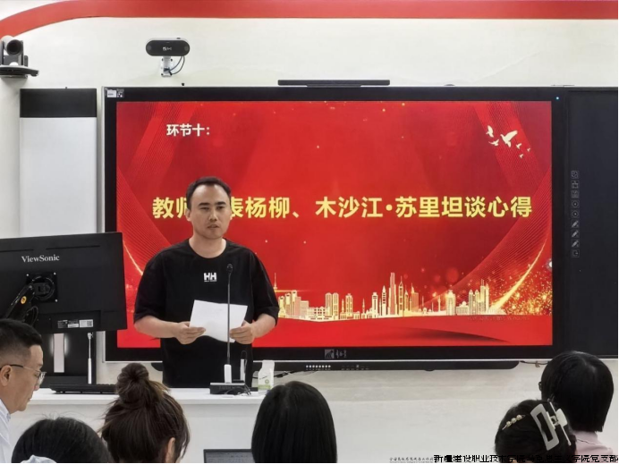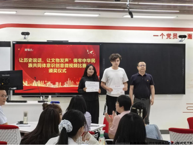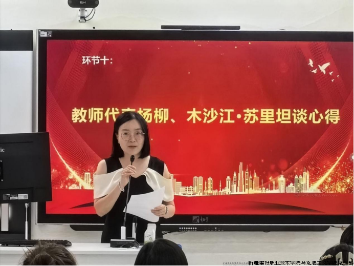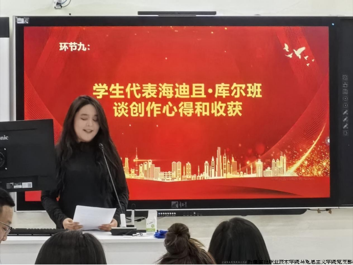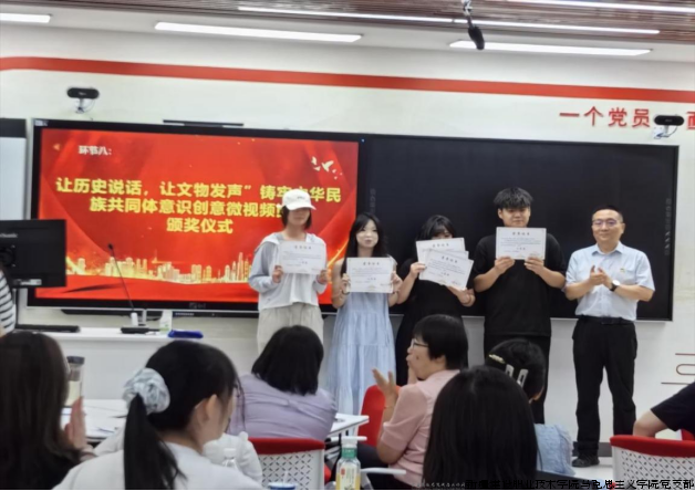 在颁奖仪式上获奖学生代表和优秀指导老师分别分享了心得体会。学生代表海迪且・库尔班畅谈了团队的创作历程与收获,她表示通过此次比赛,不仅加深了对课程内容的理解,更深刻体会到了中华民族共同体的内涵。马克思主义学院优秀指导教师代表杨柳、信息管理学院优秀指导教师木沙江・苏里坦也先后上台发言,他们从教学实践和专业指导的角度,分享了对铸牢中华民族共同体意识教育的思考,强调了实践教学在思政教育中的重要性。