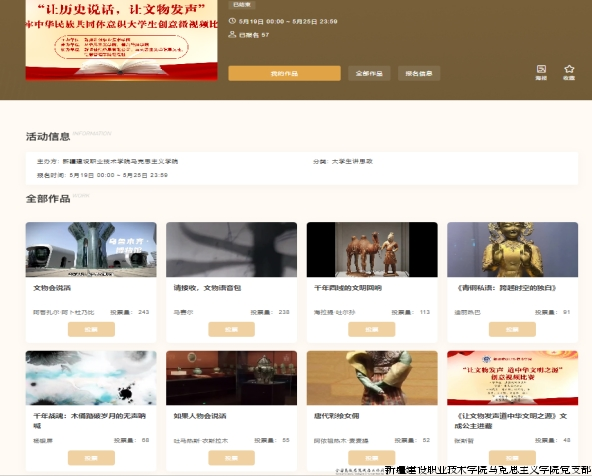 为深入贯彻落实习近平总书记关于“让收藏在博物馆里的文物活起来”的重要指示精神,推动铸牢中华民族共同体意识教育走深走实。近期,由新疆建设职业技术学院主办,马克思主义学院、信息管理学院共同承办,新疆世纪超星有限公司、马克思主义学院星火社、信息管理学院征程社协办的首届“让历史说话,让文物发声”铸牢中华民族共同体意识创意微视频比赛暨思政课实践教学活动圆满落幕。
