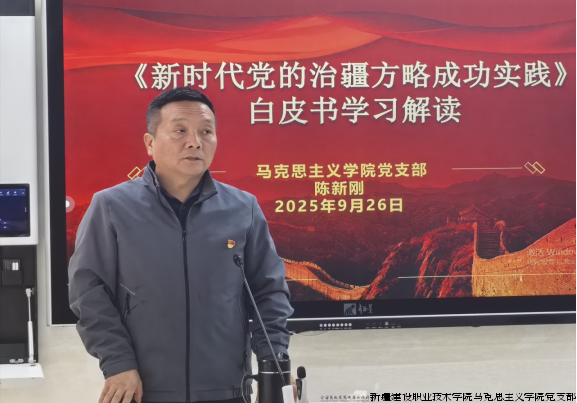 马克思主义学院支部书记陈新刚为全体党员教师上了微党课——《新时代党的治疆方略的成功实践》白皮书学习解读。微党课从历史上中央政权治理新疆的理念经验,中国共产党治理新疆的光辉历程,新时代党的治疆方略开创治疆新局面,新时代党的治疆方略的成功实践四个方面阐述了历史上中央政权治理新疆的理念经验,梳理了中国共产党治理新疆的光辉历程,重点展示了新时代党的治疆方略开创的治疆新局面,涵盖社会稳定、民族团结、民主法治、经济发展、文化繁荣、民生改善等多个领域的伟大成就。通过对《新时代党的治疆方略的成功实践》白皮书学习解读,进一步引导党员教师准确把握新时代党的治疆方略的内涵和实践成果,进一步增强责任感和使命感,为职业教育高质量发展作出应有的贡献。