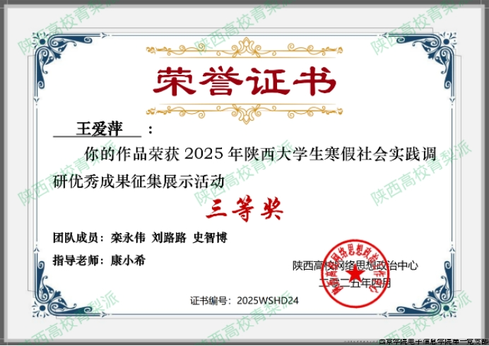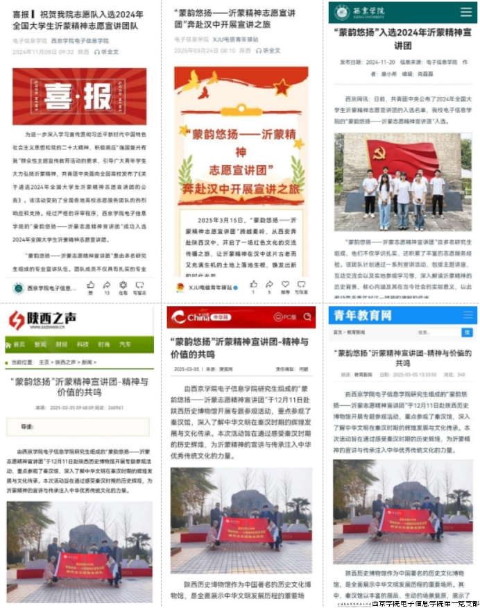 近日,由陕西高校网络思想政治工作中心主办的2025年陕西大学生寒假社会实践调研优秀成果征集展示活动圆满落幕。经过专家评审、成果展示等环节的激烈角逐,电子信息学院"蒙韵悠扬-沂蒙精神志愿宣讲团"凭借主题鲜明、形式创新的实践成果荣获三等奖。这一荣誉不仅是对团队实践成果的肯定,更展现了新时代青年赓续红色血脉、践行使命担当的青春风采。