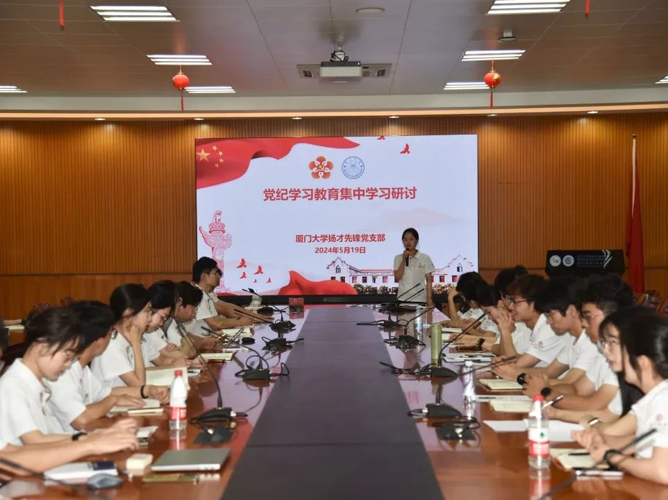 为深入贯彻落实习近平总书记关于党纪学习教育的重要讲话和重要指示精神,推动党纪学习教育走深走实,5月19日下午,扬才先锋党支部于翔安校区坤銮楼召开党纪学习教育集中学习研讨,第五期、第六期“扬才班”学员和指导老师参加。扬才先锋党支部书记董书捷主持会议。