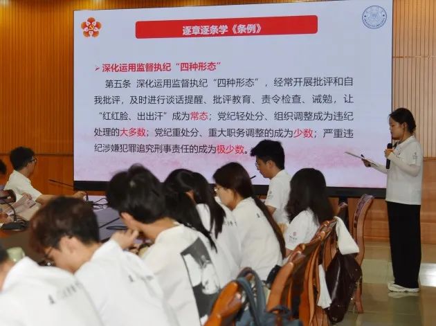首先,由董书捷领学《条例》“总则”部分第一章“总体要求和适用范围”。董书捷详细解读了《条例》的出台背景、主要内容和重要地位,并结合党史生动阐明了《条例》的总体要求及适用范围。她强调,《条例》作为规范党组织和党员行为的基础性法规,对确保全党在政治立场、政治方向、政治原则、政治道路上同以习近平同志为核心的党中央保持高度一致,具有十分重要的作用。董书捷呼吁在场学员,作为党支部书记、支委成员及学生党员,要始终保持忠诚干净担当的政治本色,始终严守规矩、不逾底线,做遵守党规国法的模范。