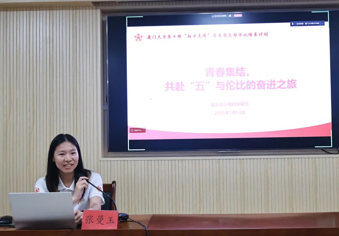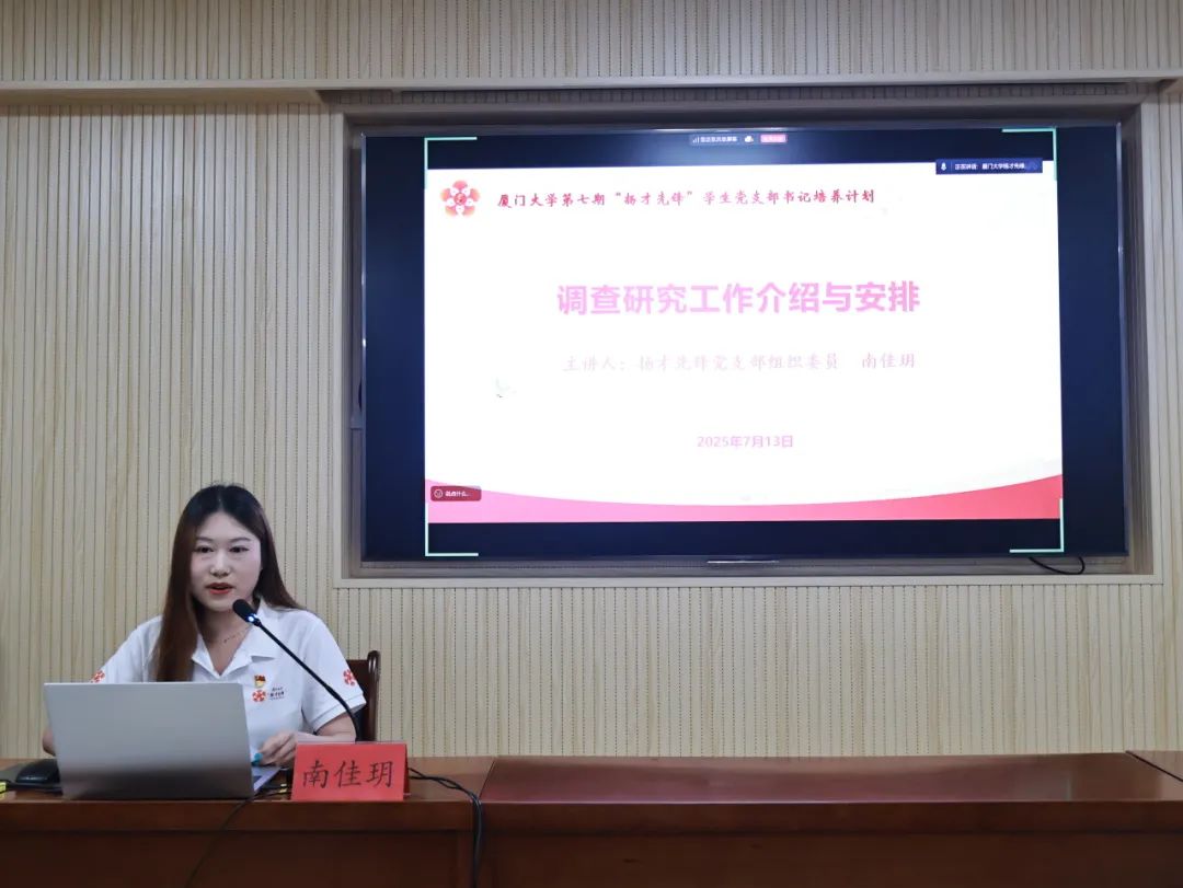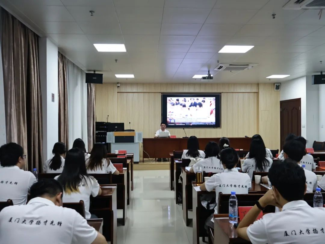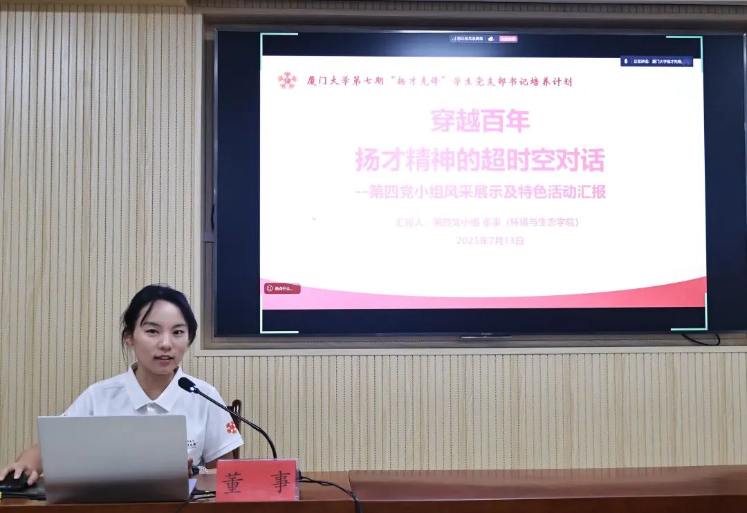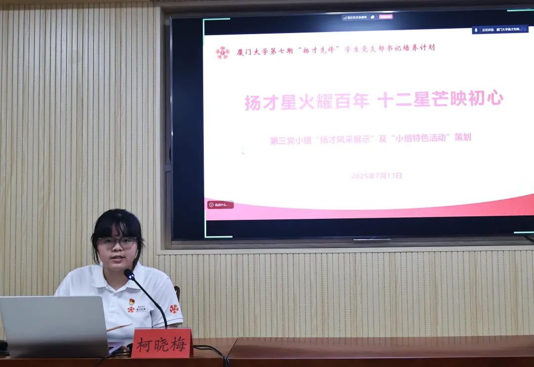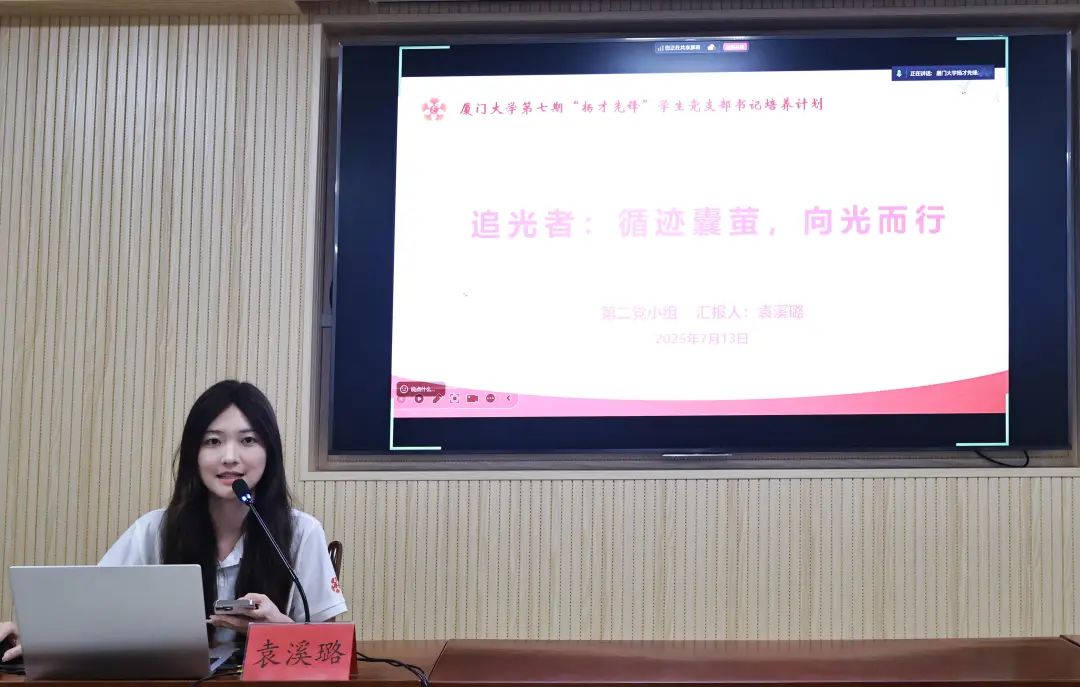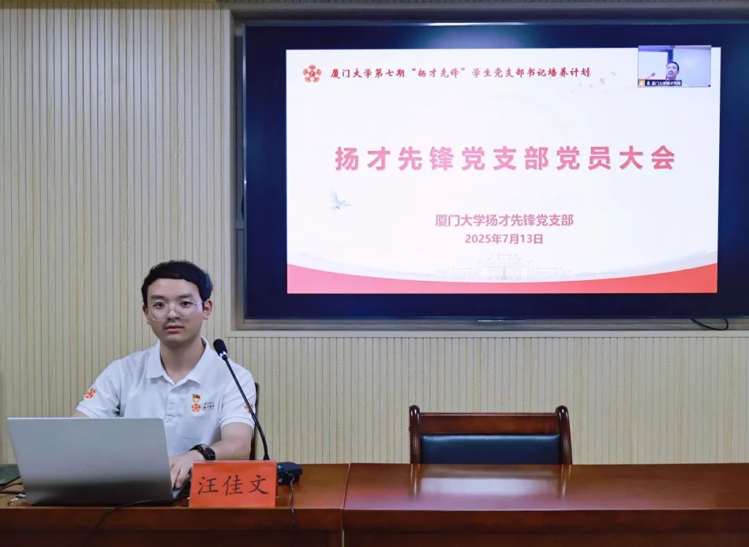 7月13日晚,厦门大学扬才先锋党支部在宁德市委党校召开2025年第三季度党员大会,通过书记领学、支委介绍、党小组分享和研讨,强化支部党员理论武装,推动交流互促。第七期“扬才班”班主任、指导老师和全体支部党员参加学习。支部书记汪佳文主持会议。