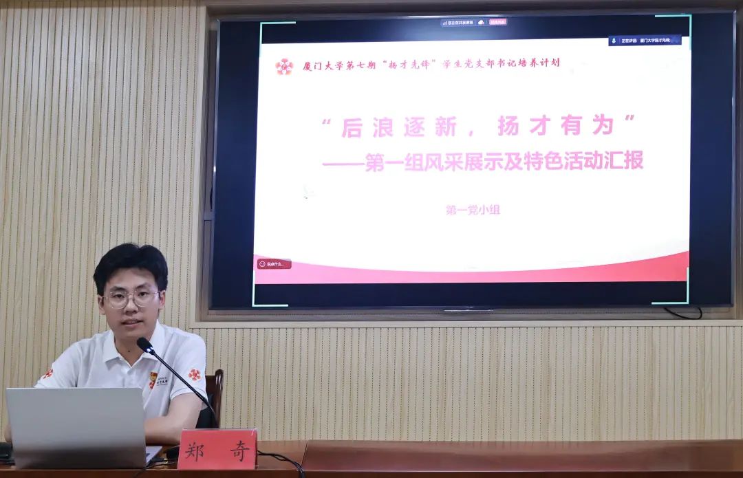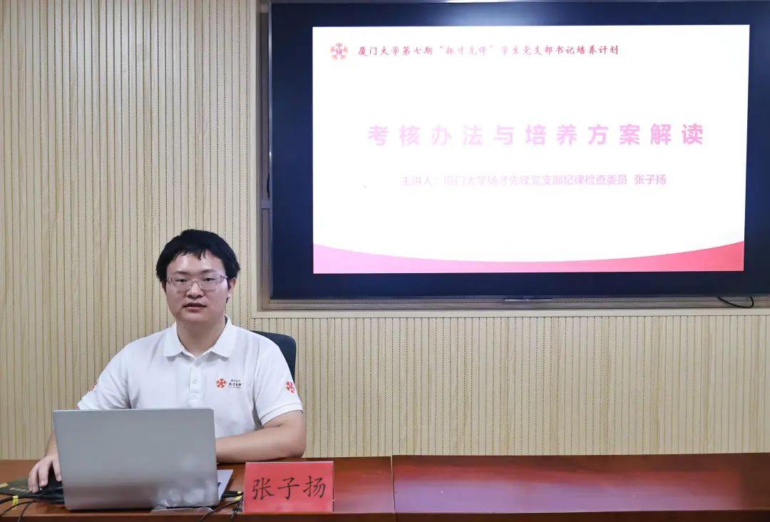 随后,党支部委员会就支部重点专项工作进行介绍,明确工作内容和方向。纪检委员张子扬详细解读《厦门大学“扬才先锋”学生党支部书记培养计划学员考核办法》,重点介绍了考核工作具体内容、考核评分标准以及考核工作全流程,引导全体党员认真完成各项考核任务,在积极参与支部活动中不断提升综合能力,收获成长与进步。