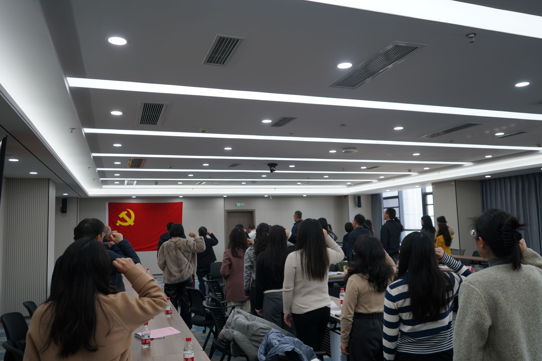 会后,全体党员同志面向党旗重温入党誓词。