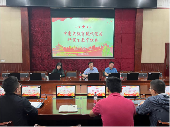 王进军带领大家回顾了中国共产党团结带领全国各族人民开展中国现代化建设的长期艰辛探索和实践,回顾了党的十八大以来我们党推进和拓展中国式现代化,全面推进中华民族伟大复兴的辉煌成就。结合党的二十大报告,系统梳理了教育现代化在中国式现代化中的重要作用以及教育现代化的发展路径。王进军强调,研究生教育是教育、科技、人才的汇聚性载体,肩负着高层次人才培养的光荣使命,研究生教育已经进入高质量发展的新阶段,我们要心怀“国之大者”,坚持“四个面向”,不断完善自主培养创新人才体系,以更好的适应新时代、新形势、新挑战。我们要坚持为党育人、为国育才,以加快培养国家急需的高层次人才为中心,以服务支撑经济社会高质量发展为导向,落实立德树人根本任务,加强导师队伍建设,全面深化改革,推进研究生教育治理现代化,努力建设好高质量研究生教育体系,为党和国家事业发展培养更多高层次人才,在全面建设社会主义现代化国家、全面推进中华民族伟大复兴的新征程上,作出新的更大贡献。