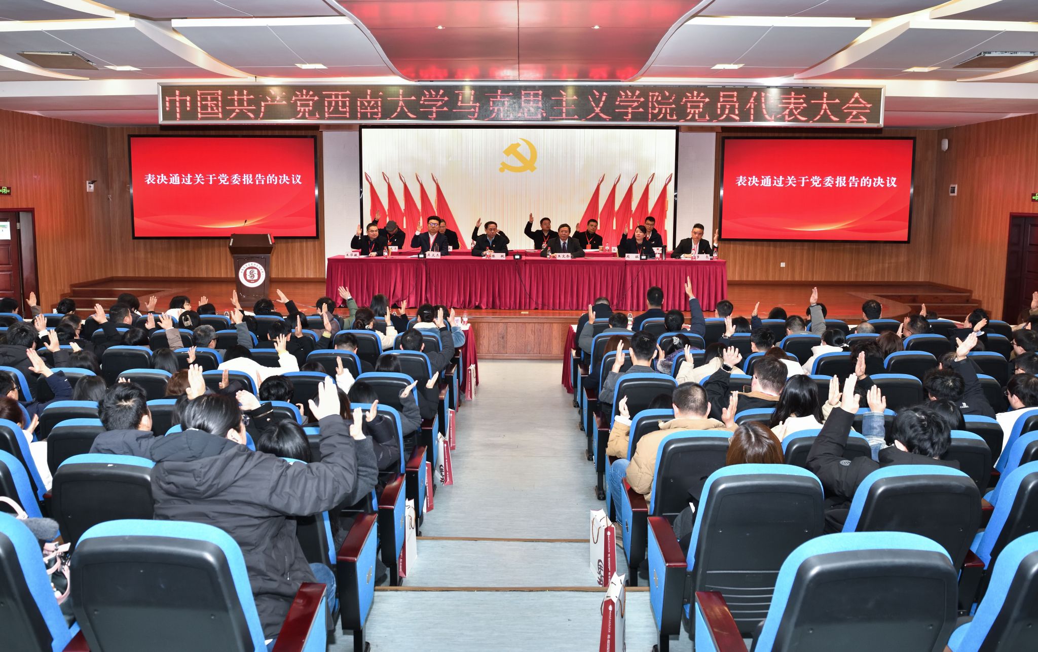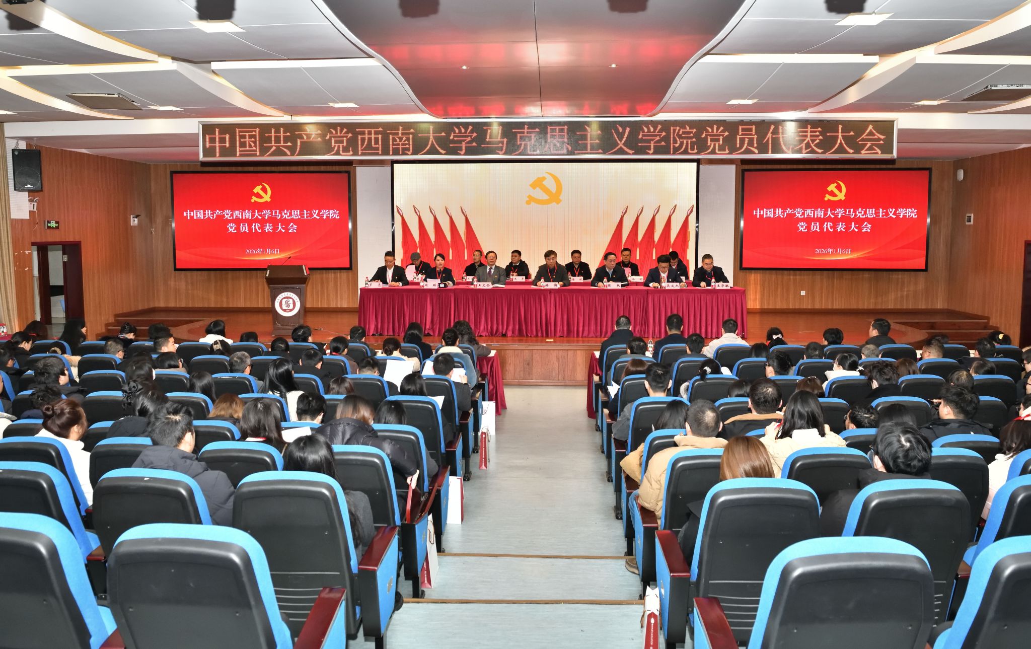 2026年1月6日上午,中国共产党西南大学马克思主义学院党员大会顺利召开。本次大会的主题是:以习近平新时代中国特色社会主义思想为指导,深学笃用习近平总书记关于教育的重要论述,坚持和加强党的全面领导,落实立德树人根本任务,全面贯彻党的教育方针,团结带领全体党员同志和全院师生员工,团结奋进、以质图强,努力建设特色鲜明的全国一流马克思主义学院,为教育强国建设贡献马院力量!