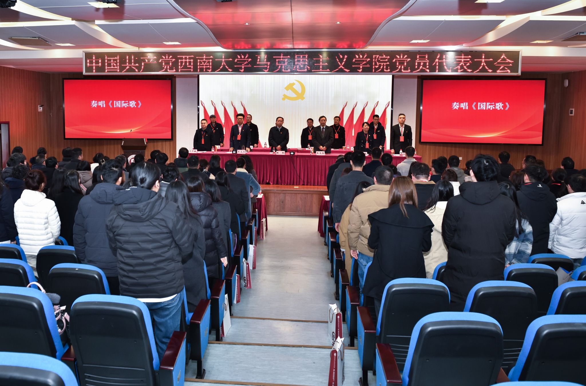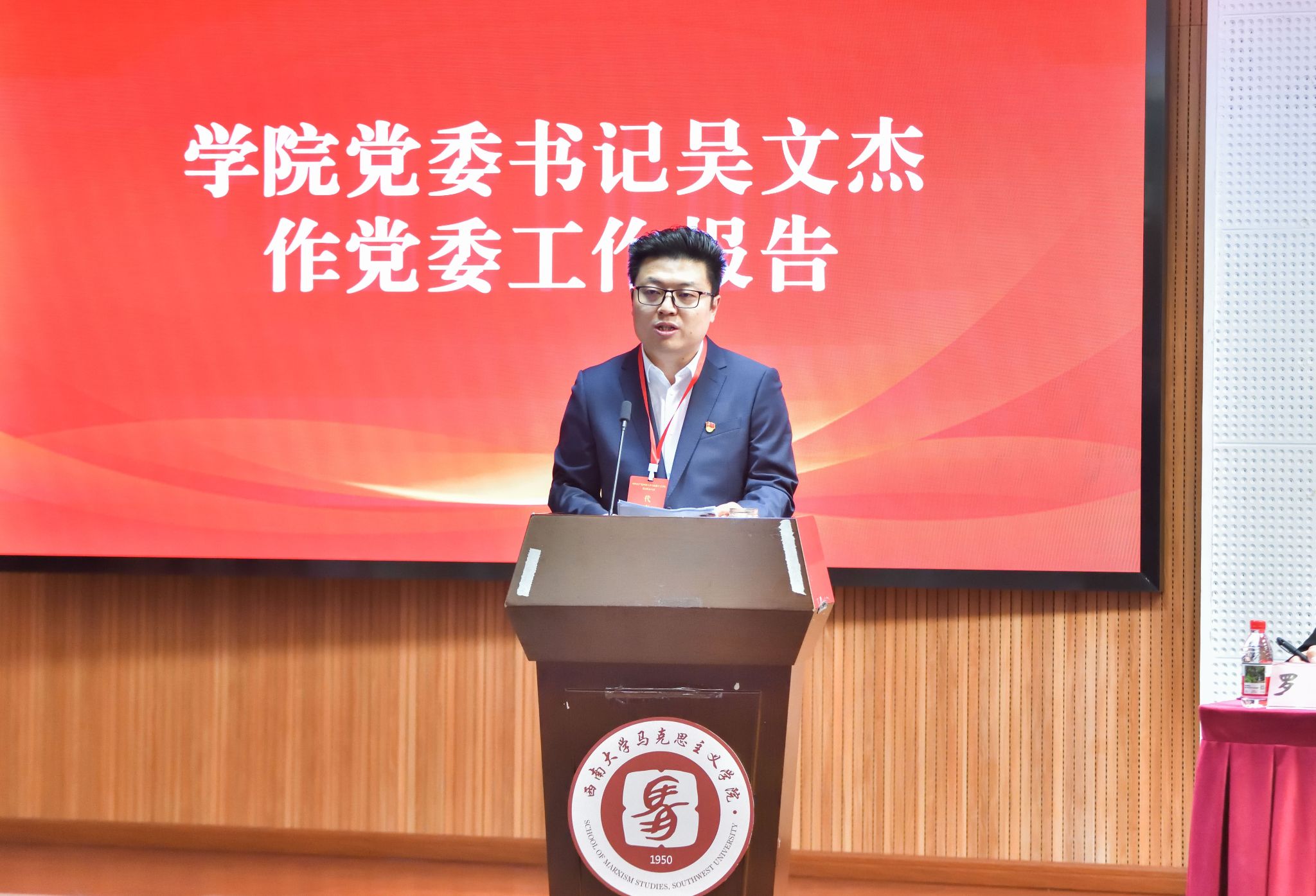 大会在国歌声中拉开序幕,吴文杰同志代表中共西南大学马克思主义学院委员会作题为《团结奋进 以质图强 努力建设特色鲜明的全国一流马克思主义学院》的工作报告。