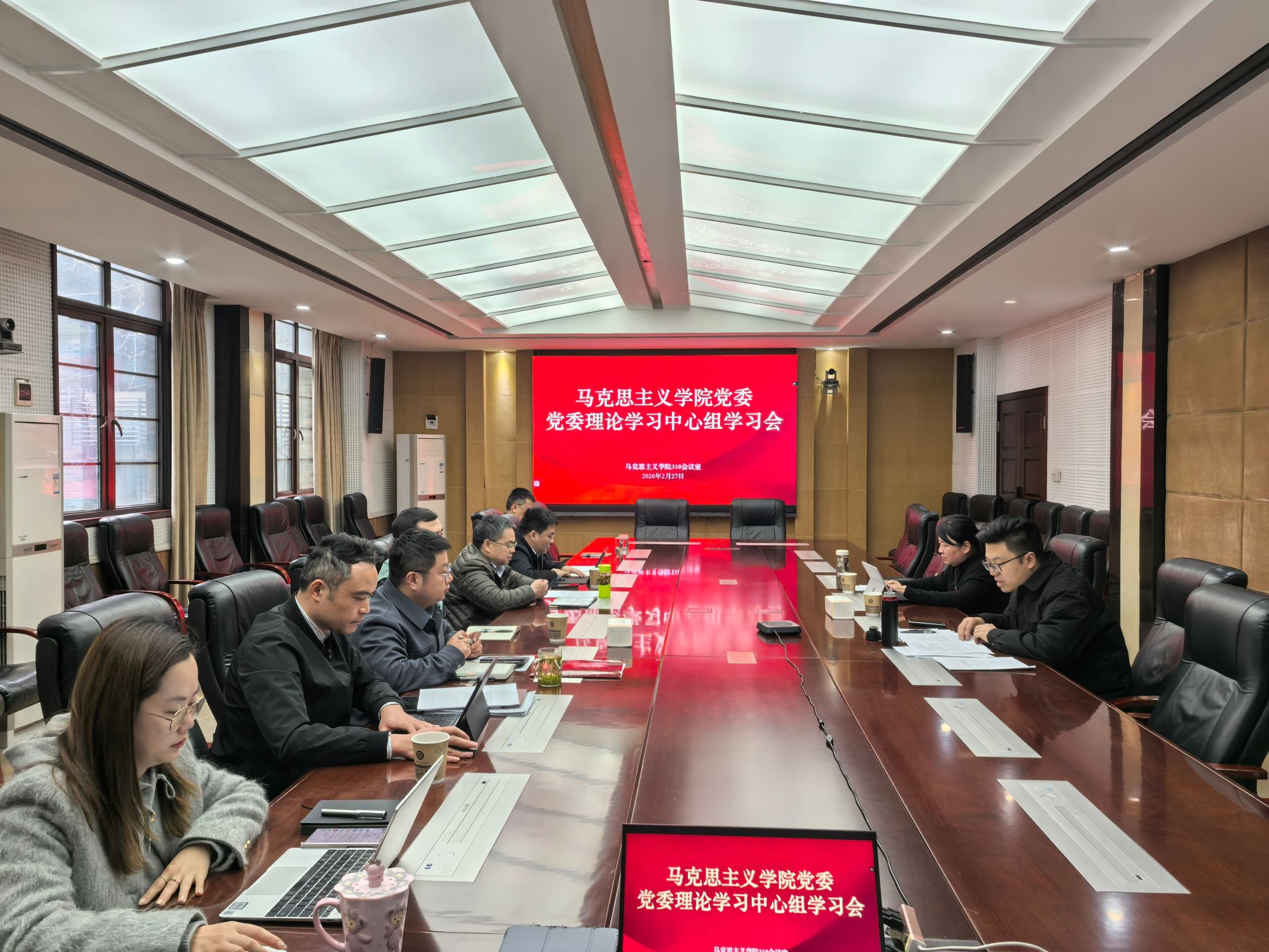2月27日下午3:00,马克思主义学院党委在学院310会议室召开2026年第一次党委理论学习中心组学习会。本次学习会主题为学院处级党员领导干部2025年度民主生活会理论学习会,学院党委理论学习中心组成员参加会议,学院党委书记吴文杰主持会议。