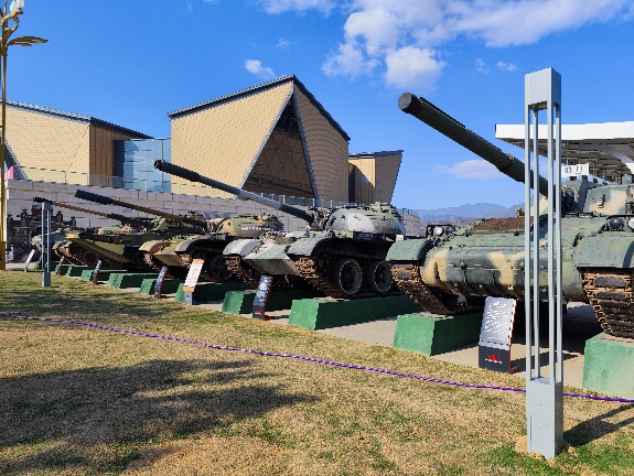 进入博物馆馆区,首先印入眼帘的是刻在石碑上宋平同志亲笔题写的“攀枝花中国三线建设博物馆”馆名。馆前广场摆放着解放军退役坦克、飞机、装甲车和榴弹炮等军事装备,还停放着一辆见证了攀钢的发展和建设并为攀钢服役了44年之久的上游320号蒸汽机车。