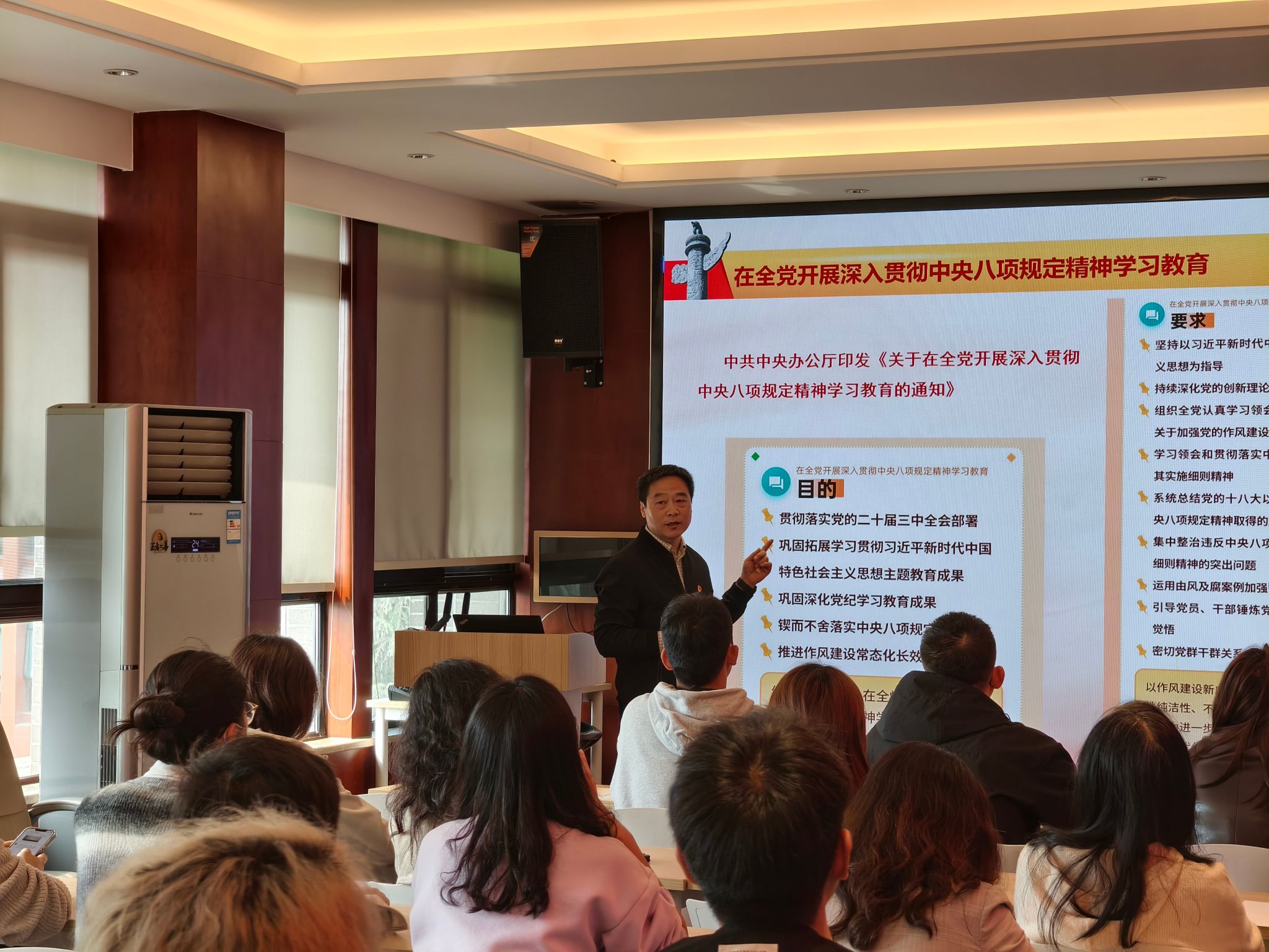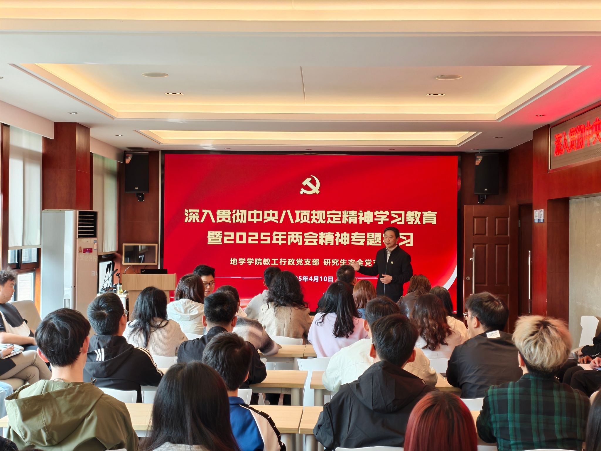 为深入学习习近平总书记关于加强党的作风建设的重要论述和中央八项规定及其实施细则精神,4月10日上午,地学学院党委在X4520会议室举行深入贯彻中央八项规定精神学习教育工作暨2025年两会精神专题党课。党课由教工行政党支部书记杜鸿主持,地学学院党委书记关秦川同志主讲,教工行政党支部以及各研究生安全党支部的全体成员参加党课。