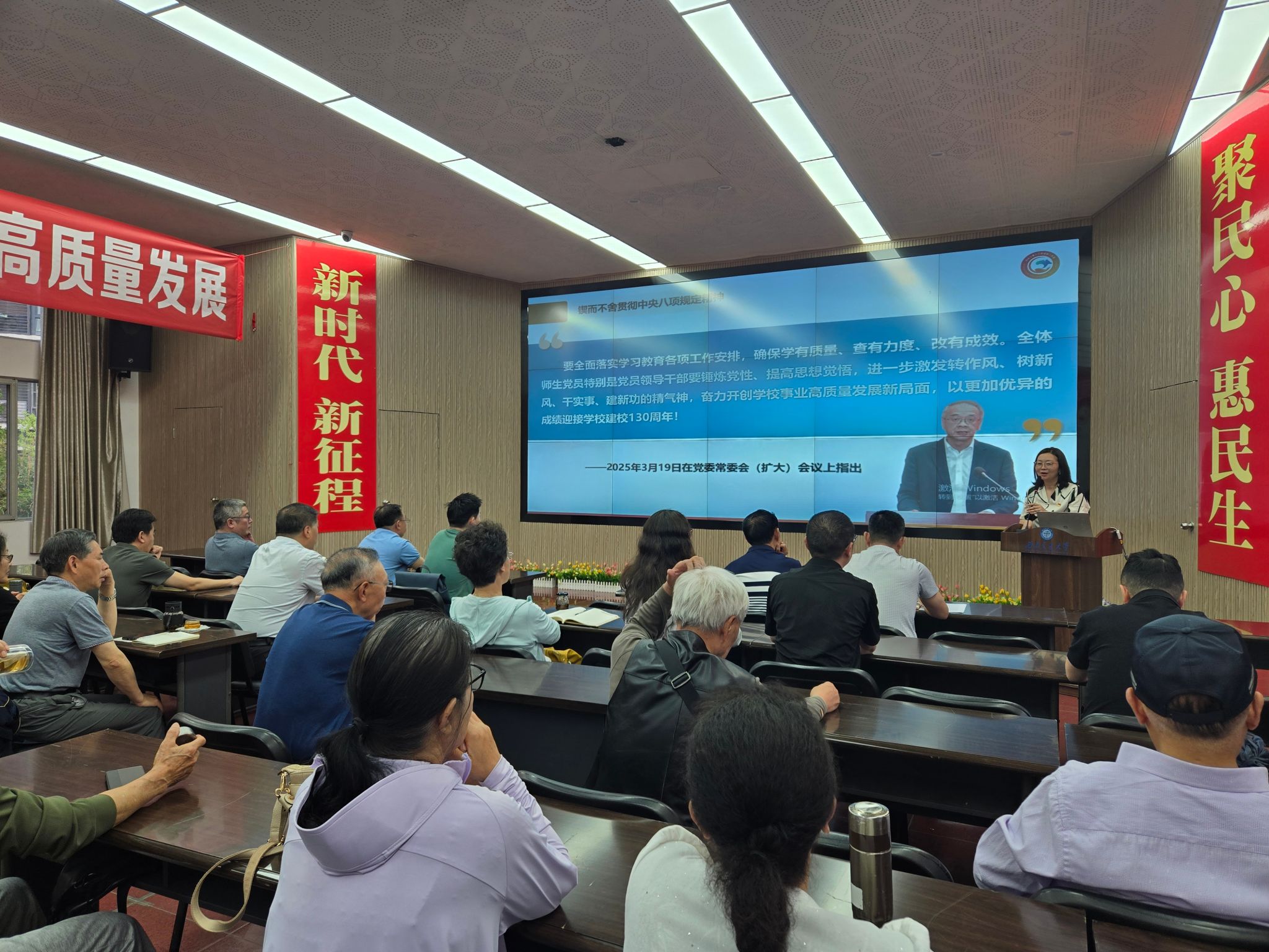 5月7日下午,离退休工作处党委在九里校区晚晴苑多功能厅举办《学习中央八项规定精神筑牢廉洁自律防线》主题党课及“违反中央八项规定精神典型案例”专题警示教育大会。活动由党委书记蒋佳,党委副书记、纪委书记谢彬担任主讲。全体党委委员、各党支部骨干成员、互助联络组教师代表以及全体在职党员共同参与学习教育活动。