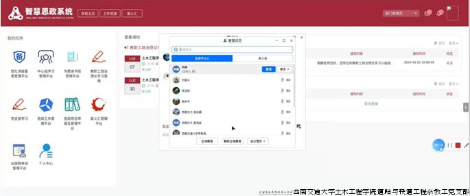 3月22日,本人所在的土木工程学院为各系教职工精心组织了一场智慧思政系统操作线上培训会。本次培训旨在深化教职工对智慧思政系统的理解,提升操作能力,从而更好地服务于学院的思想政治教育工作。作为一名新进入土木工程流动站的博士后,我有幸参加了本次培训,收获颇多。