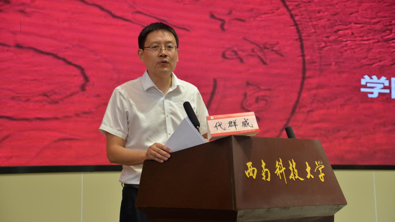 随后,由西南科技大学副校长朱强为新生详解西南科技大学从建材学院到“产学研标杆”的传奇之路。他介绍我校从1978年的四川建筑材料工业学院到如今拥有青义、西山、城南三个校区的西南科技大学,走出了一条有自己特色的办学路子。在领导班子与办学特色方面,朱强提到学校的发展始终得到多方关注与支持;在人文情怀方面,西南科技大学秉持“厚德、博学、笃行、创新”校训,发扬“艰苦奋斗,拼搏创新”精神,落实立德树人根本任务;在学生培养上,致力于培养全面发展、能引领科技创新、支撑行业发展的人才;在社会服务上,参与“天问一号”火星车材料制备、川藏铁路站点建设等重大工程,还助力九寨黄龙钙华修复,尽显责任担当。作为原国家建材局直属的5所高校之一,西南科技大学如今已成为5所中唯一扎根西部、特色鲜明的综合性高校,持续为区域发展与国家战略贡献力量。