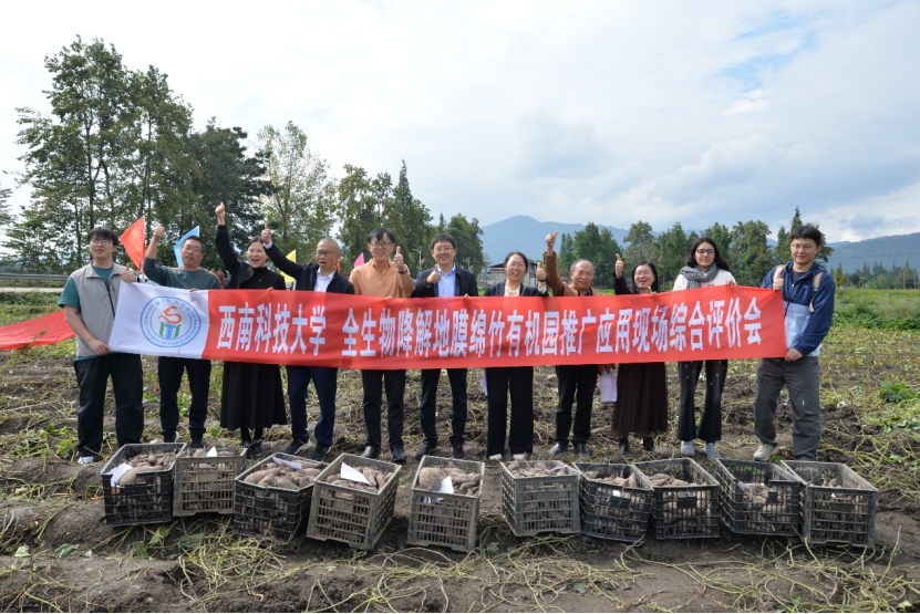 近日,西南科技大学环境与资源学院李旭娟博士团队承担的四川省科技厅两项重点研发项目——《新疆干热气候区可降解地膜保湿抗老化研究与应用示范》与《含两相取向结构的高阻水PBAT复合膜的可控制备及阻水机理研究》,成果在绵竹市广济镇顺利完成从技术研发到示范应用的全链条转化,并通过现场验收。项目成果受邀在当地的蜜薯节上亮相,接受了来自专家学者、地方政府及种植户的实地检验,进一步提升了技术影响力与社会认可度。