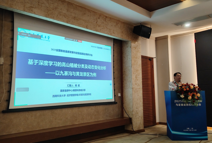 国家遥感中心绵阳科技城分部主任、经济管理学院党委书记杨斌受邀参加此次大会,针对遥感技术在生态环境、湿地生态系统中的应用研究情况,做了题为“基于深度学习的高山植被分类及动态变化分析——以九寨沟与黄龙景区为例”的大会特邀报告。报告结合国家自然科学基金重点项目的部分研究成果,深入探讨了智能遥感解析算法在九寨沟、黄龙景区特殊区位环境下的高山植被分类情况,从光谱、地形与生态三大方面构建了研究区多维特征数据集,该数据集全面表征九寨沟、黄龙景区的地表与生境特征,并构建了基于CNN与Transformer融合的STEI-CTNet模型,该模型较好地实现了高山地区“光谱–空间–时间”维度的植被特征动态解译,为西部地区高海拔、高烈度地区的植被特征研究提供了研究思路。
