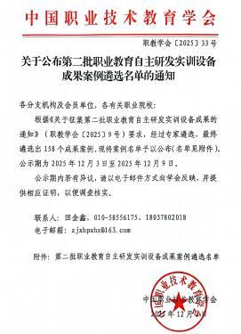 中国职业技术教育学会在2025年职业教育自主研发实训设备成果案例遴选工作中,公布了2025年职业教育自主研发实训设备成果第一批、第二批及第三批案例遴选名单。全国约180所职业院校374项案例入选。咸宁职业技术学院工学院教师第二党支部赫焕丽、谢承、王海平、陈楠、李慧娟等教师团队研发的5项成果成功入选,充分体现了我支部在自主创新与实训教学改革方面的显著成效。