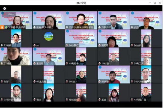 2月3日上午,培训班通过线上会议的形式举行了隆重的结班典礼。新乡学院副校长宋伟教授、数学统计学院院长梁桂珍教授、部分培训专家代表、项目工作组全体成员以及来自周口市、漯河市、驻马店市的79名参训教师参加了结班典礼。结班典礼由新乡学院数学与统计学院皮磊副院长主持。
