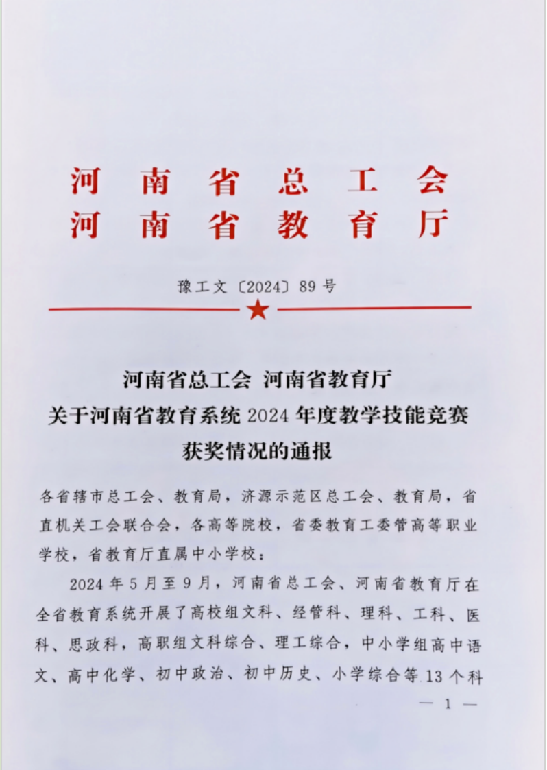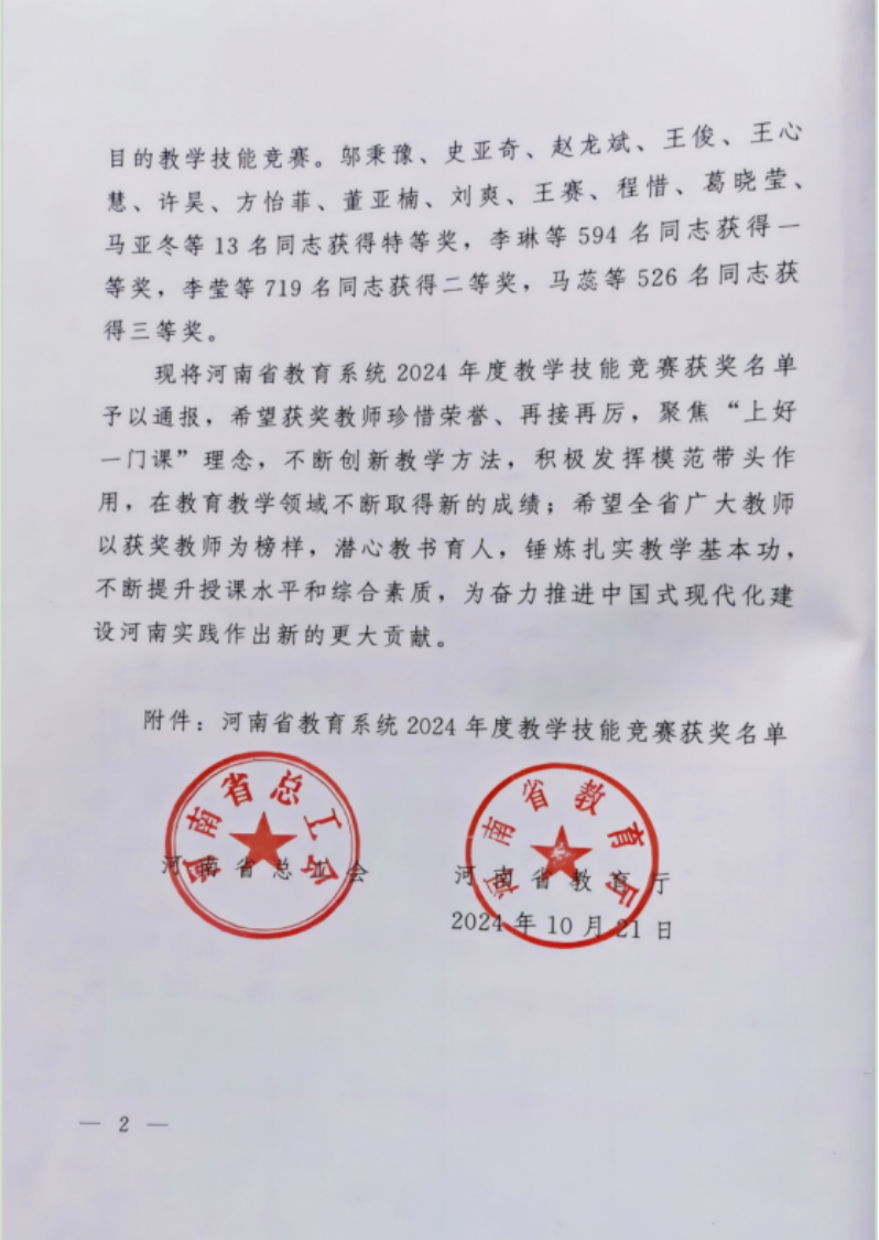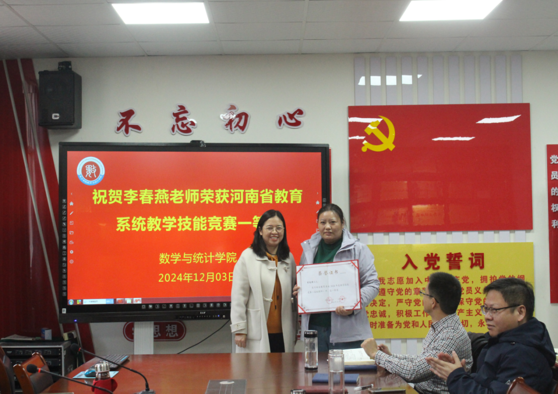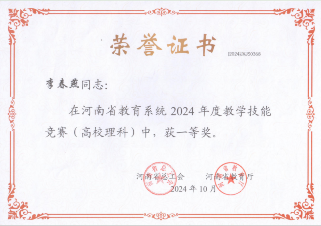 近日,由河南省总工会、河南省教育厅共同举办的2024年河南省教育系统教学技能竞赛成绩揭晓。数学与统计学院李春燕老师经过激烈角逐,凭借扎实的数学专业教学能力和创新的教学设计赢得评委专家的高度认可,最终获评该竞赛高校理科组一等奖。