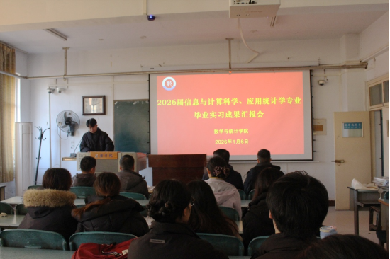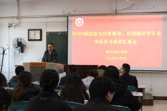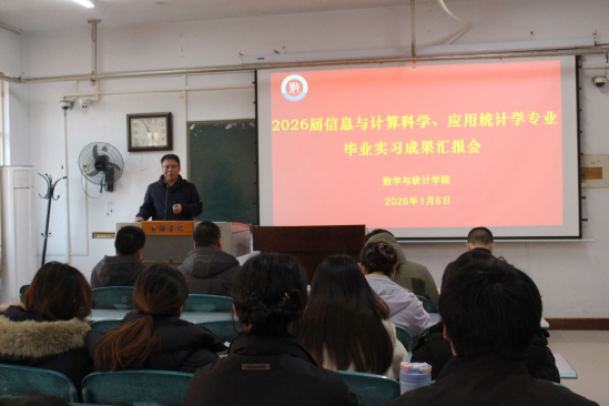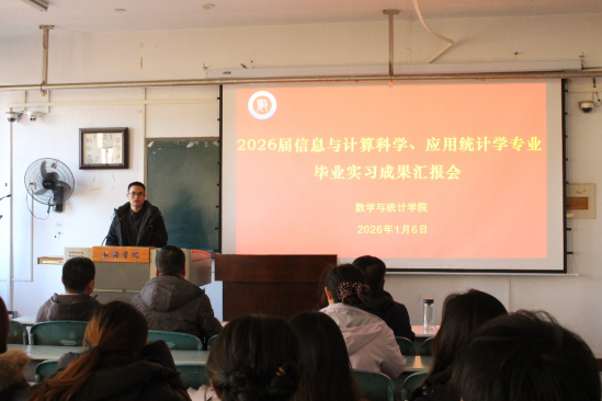 为全面总结毕业生在政府部门和企事业单位开展实习的工作成效,进一步深化校地、校企协同育人机制,2026年1月6日下午,数学与统计学院在A14楼614教室召开2026届信息与计算科学、应用统计学专业实习成果汇报会。学院副院长皮磊、信息与计算科学教研室主任姚广、应用统计学教研室主任许寿方、教科研秘书王秀旺、党政办主任庄乐森及李鑫、陈晓利等指导教师团队代表出席会议,2026届信实践育人息与计算科学、应用统计学专业毕业生参加本次汇报会。会议由学生张俊宇主持。