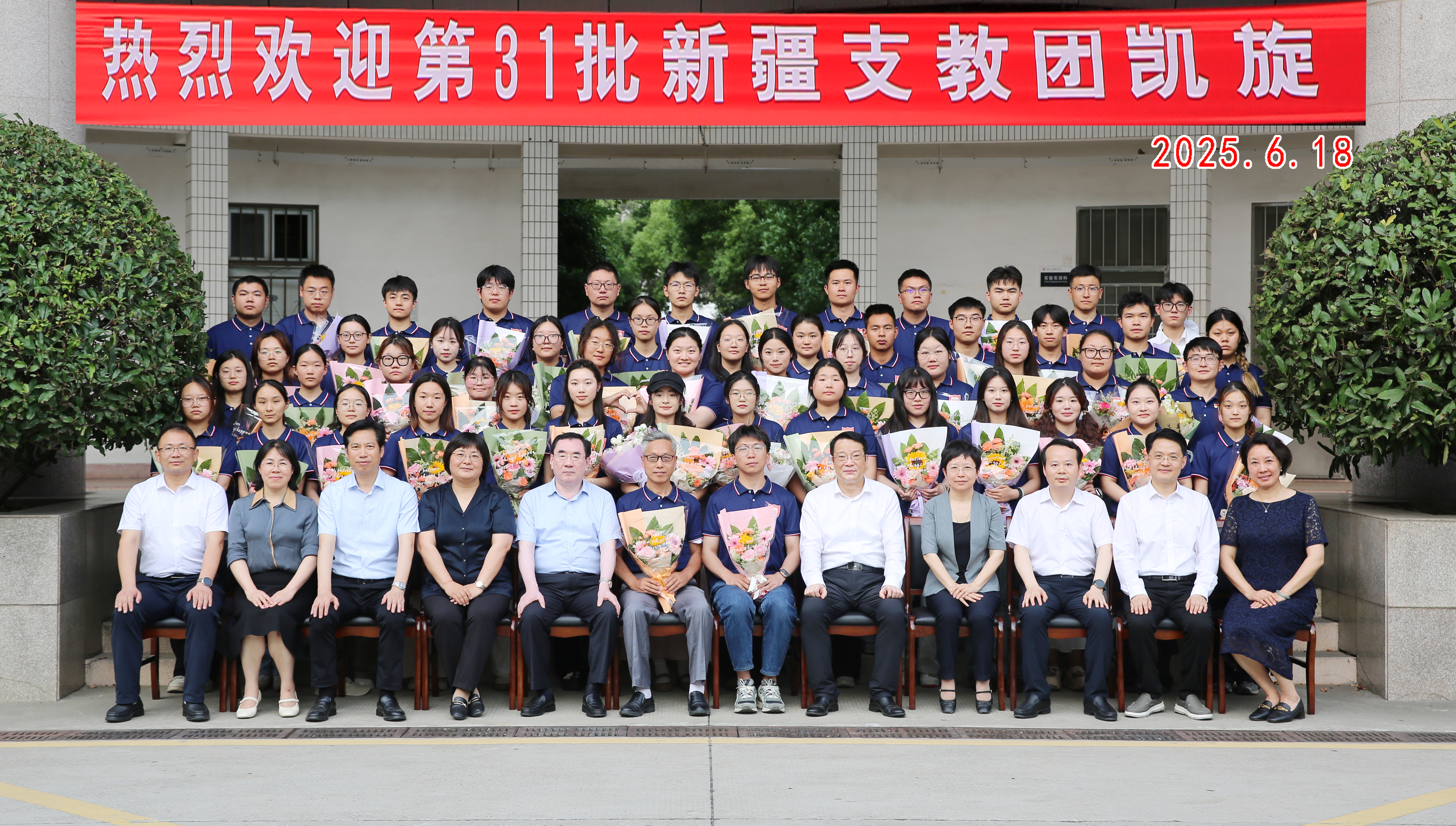 欢迎现场气氛热烈,校领导与支教师生亲切握手,详细询问支教期间工作生活情况,高度肯定他们在新疆教育一线的坚守与付出。在校学生代表手持鲜花向支教团成员献上祝福。随后,全体人员在图书馆前合影留念。