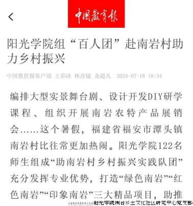 阳光学院“百人团一村”社会实践模式自2019年起,聚焦南岩村振兴,从规划、文旅、研学、电商等多领域,助力发展“生态+文旅”产业。目前,阳光学院已形成多院协作、实践育人的长效机制,并助力南岩村成为首个“零合成洗涤剂试点村”。