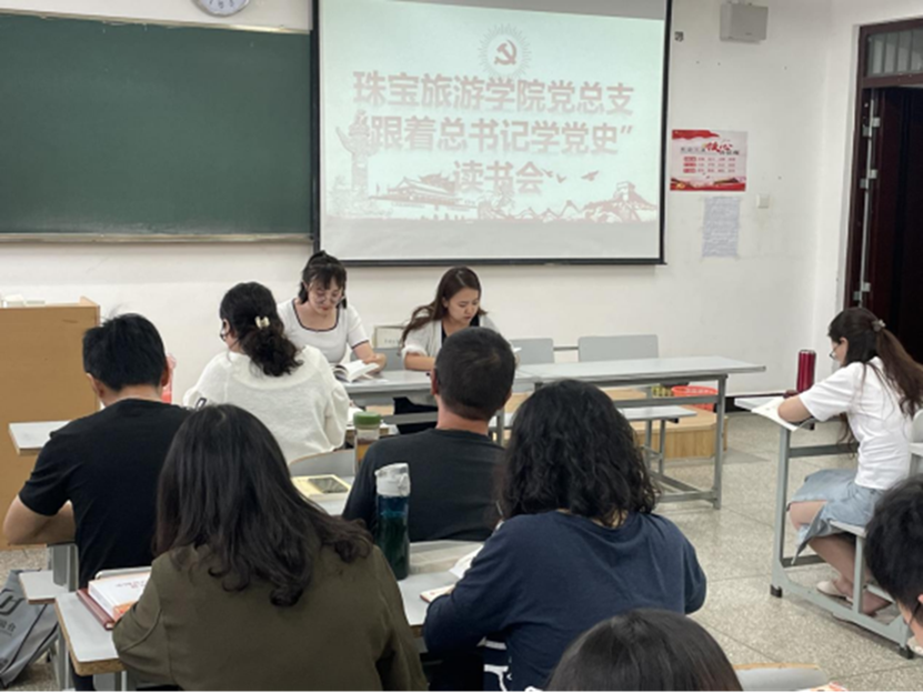 2021年9月22日星期三下午14:30分珠宝旅游学院党总支宝石党支部在笃行楼201教室举行“跟着总书记学党史”读书交流会,号召各位老师积极学党史、悟思想、办实事、开新局。会议由珠宝旅游学院专职组织员刘迪主持。