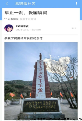 二是以理论学习为主抓手,厚植爱国主义情怀。传承红色精神,弘扬爱国文化,身为新时代党员,心中存国,实践爱国,是务必牢记的初心与理念。为记录这爱国的点滴,弘扬爱国精神,支部组织开展“举止一刹,爱国瞬间”爱国教育主题活动。活动通过盘点爱国时刻,记述自己近一年内参与过的与爱国主题相关的活动和记录爱国瞬间,记述近一年内所经历、所听闻的爱国事件为主要形式,并依托学院易班网进行展示和分享,引导学院其他党员及同学们更深入地理解红色精神,弘扬爱国文化,将爱国之情转化为实际行动。