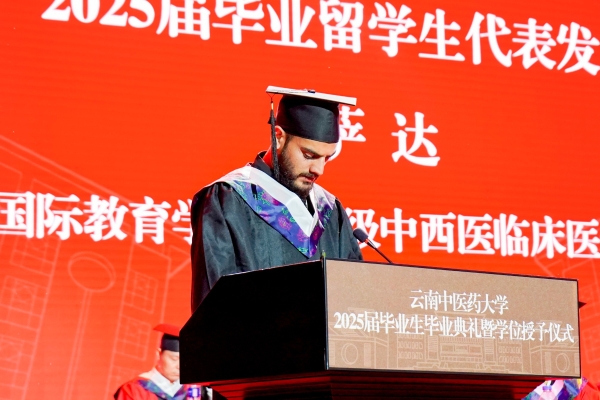 毕业留学生代表萨达深情讲述了在中国求学的经历与收获。他表示,毕业后将用所学知识将中医的理念和方法与西医结合,为更多患者提供更全面的医疗服务,并努力成为中医文化的传播者。
