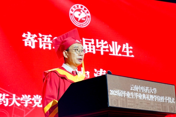 丁中涛以“守住根脉,绽放新蕊”为题发表致辞,他代表学校向全体毕业生表示热烈祝贺,对辛勤付出的教师、家长及社会各界人士表示衷心感谢。他回顾了学校的发展历程和办学成就,特别提到在本科办学65周年之际,学校培养了一批批中医药传人和优秀学子,为地方健康事业作出了巨大贡献。他鼓励毕业生们牢记“崇德和合、博学敦行”的校训,将个人理想融入国家战略,为中医药事业的传承创新贡献力量。