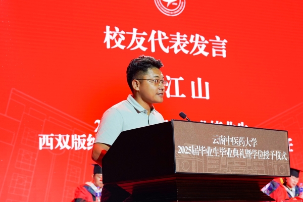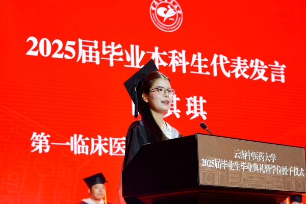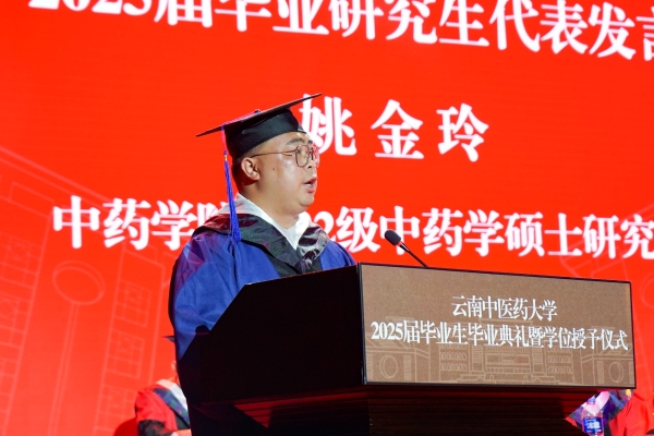 毕业研究生代表姚金玲分享了他在学校的十年求学经历。他见证了中医药创新创业的热潮,也经历了创业路上的风雨无阻。他鼓励毕业生们要耐得住寂寞、做团队中的药引、让传统智慧与现代科技相得益彰。