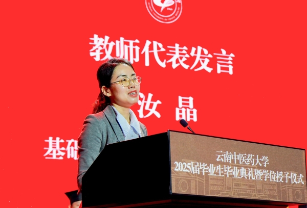 教师代表汝晶在发言中深情回顾了与学生们共度的时光,她以“书山苦旅”和“临床淬炼”为线索,讲述了学生们在学医路上的艰辛与收获,勉励大家精于业、诚于心、立于德,在未来的职业生涯中不断追求卓越,成为医者仁心的典范。